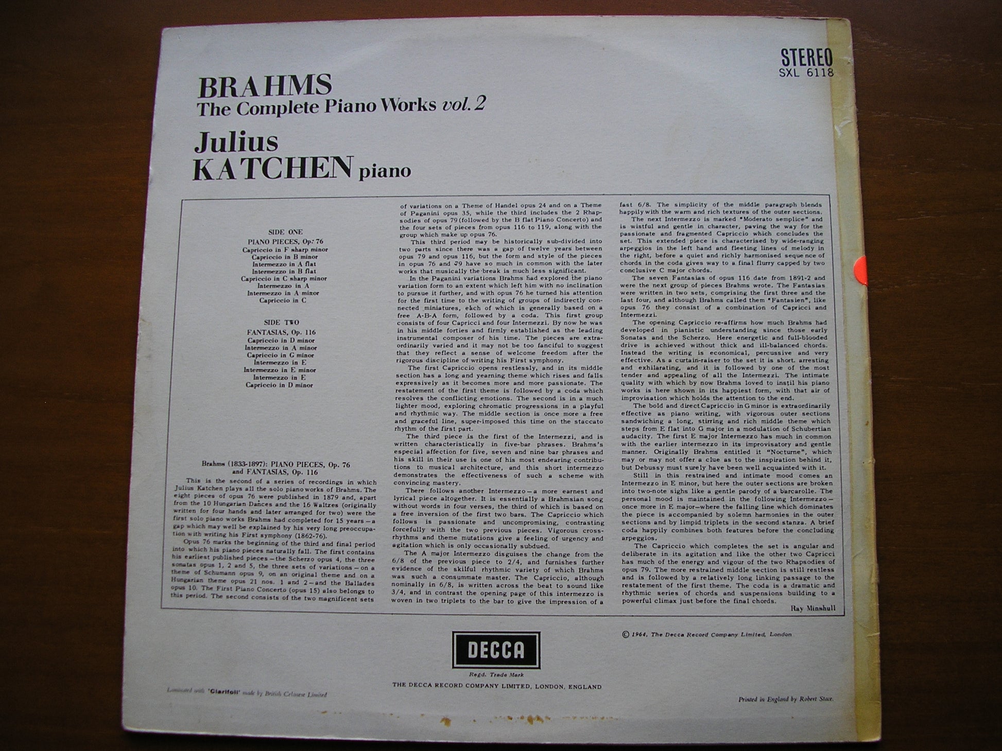 BRAHMS: COMPLETE SOLO PIANO MUSIC Volume 2: PIANO PIECES Op.76 / FANTASIAS Op.116 JULIUS KATCHEN test pressing SXL 6118