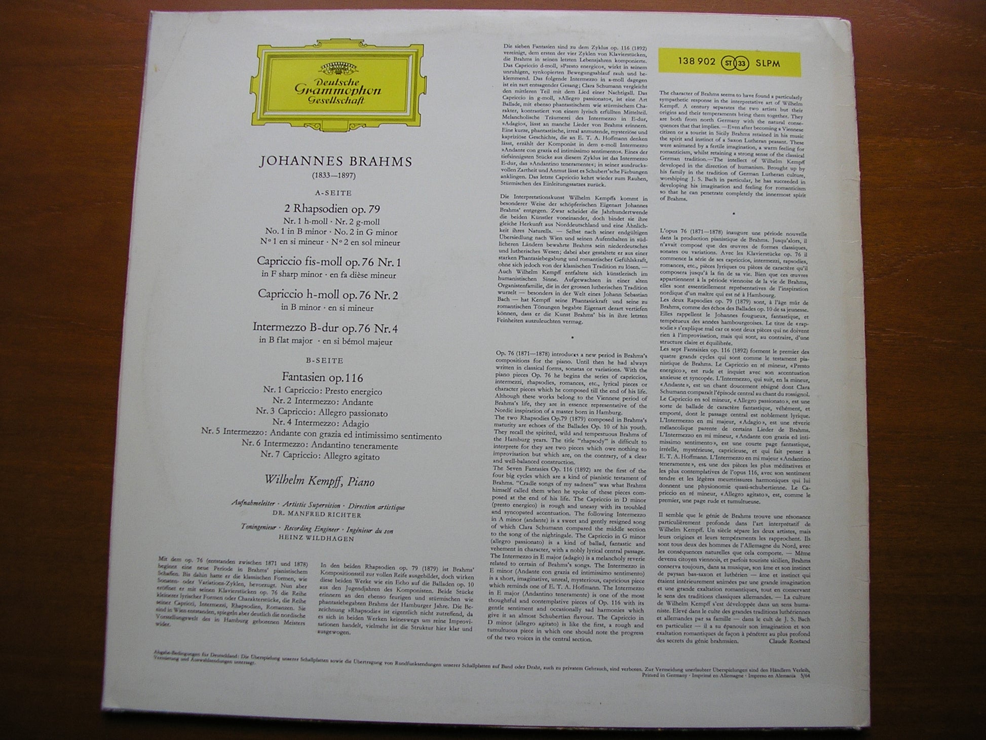 138 902  BRAHMS: FANTASIEN Op. 116 / RHAPSODIES / CAPRICCI / INTERMEZZO  WILHELM KEMPFF