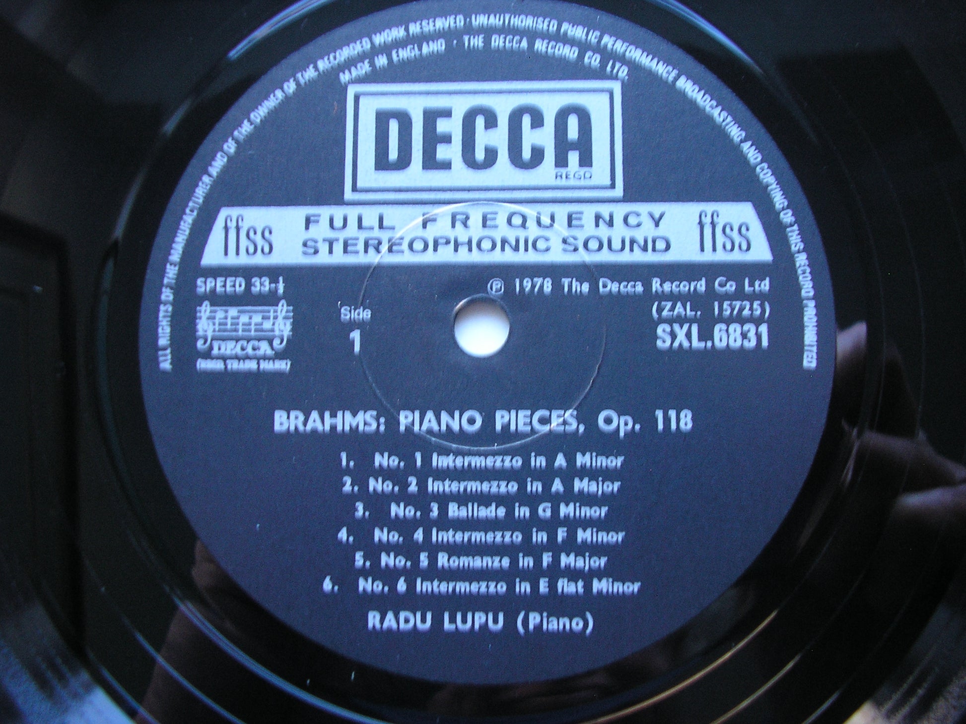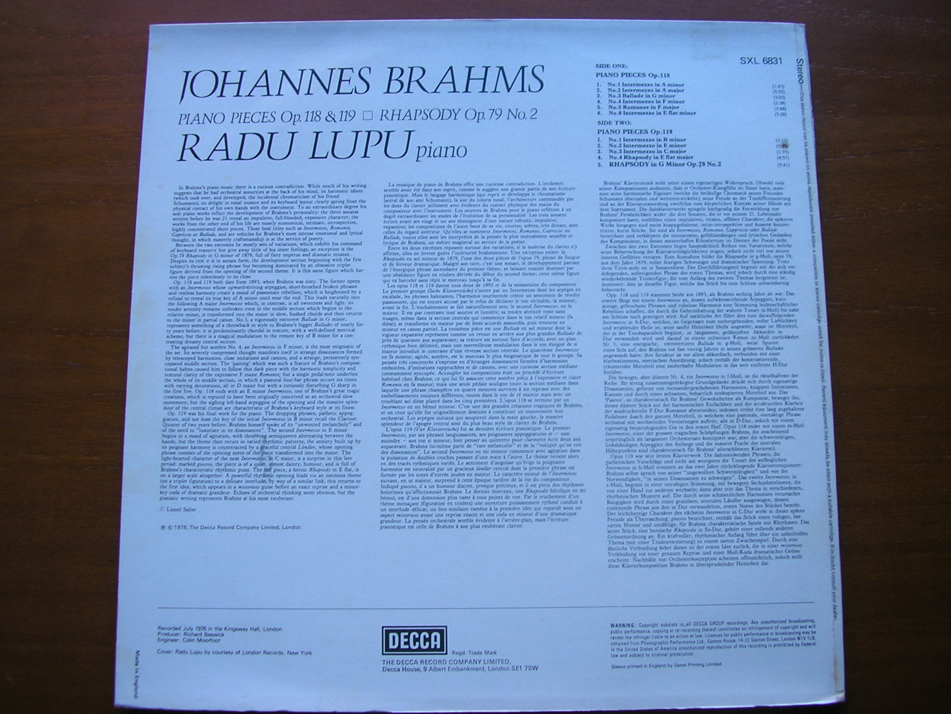 SXL 6831 BRAHMS: PIANO PIECES / RHAPSODY      RADU LUPU