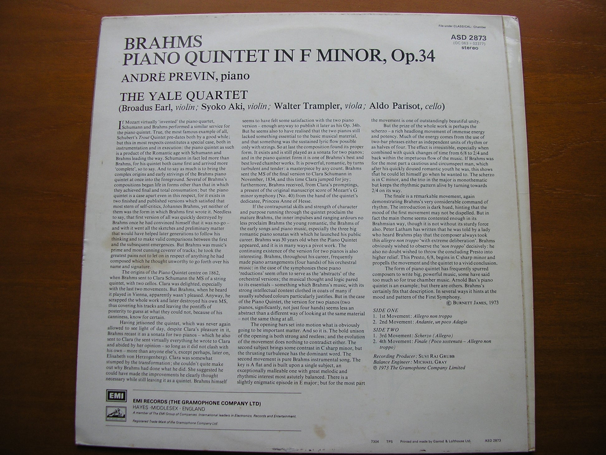 ASD 2873 BRAHMS: PIANO QUINTET in F      ANDRE PREVIN / THE YALE QUARTET