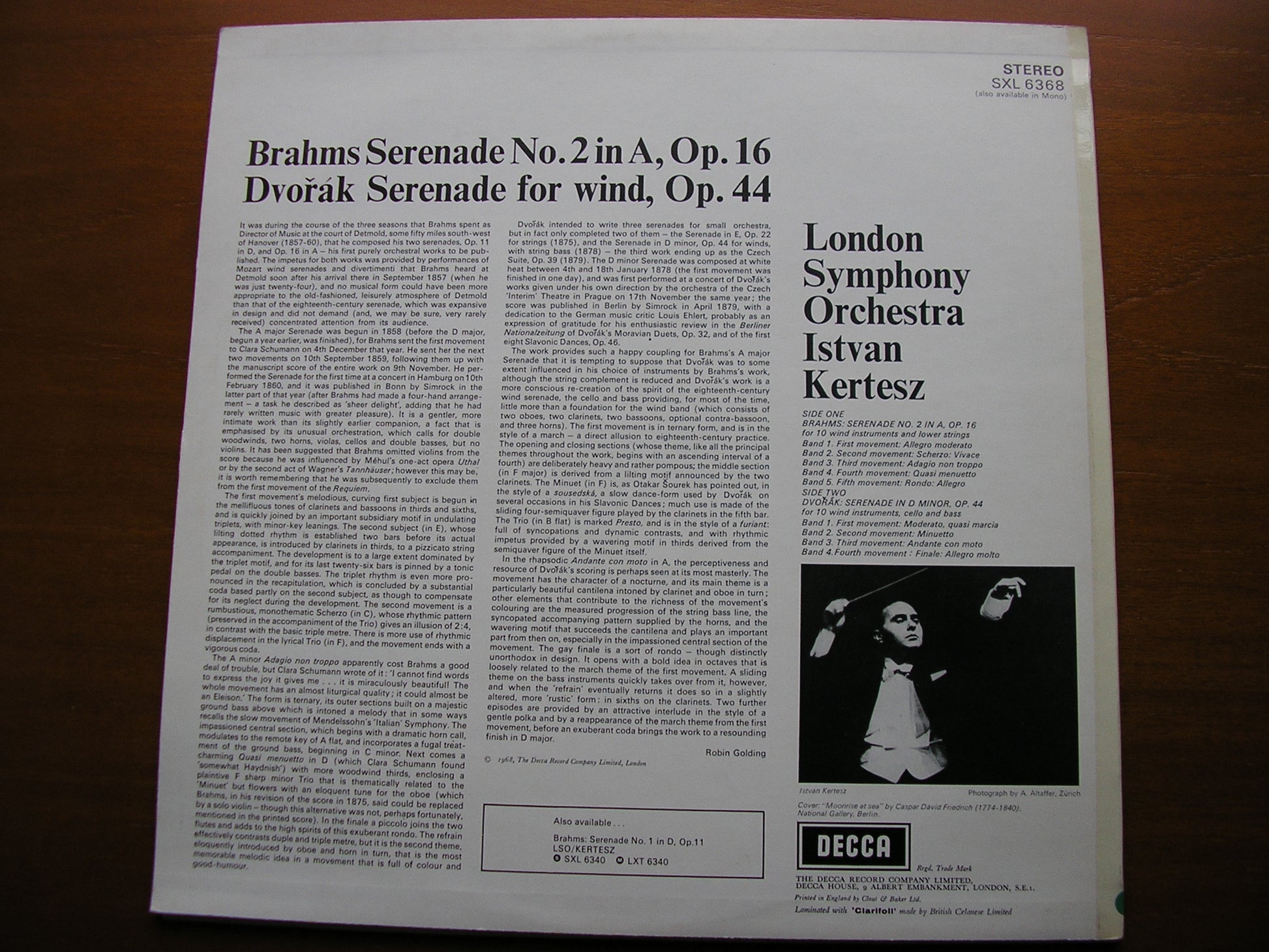 BRAHMS: SERENADE No. 2 / DVORAK: SERENADE FOR WIND Op. 44 KERTESZ / LONDON SYMPHONY SXL 6368