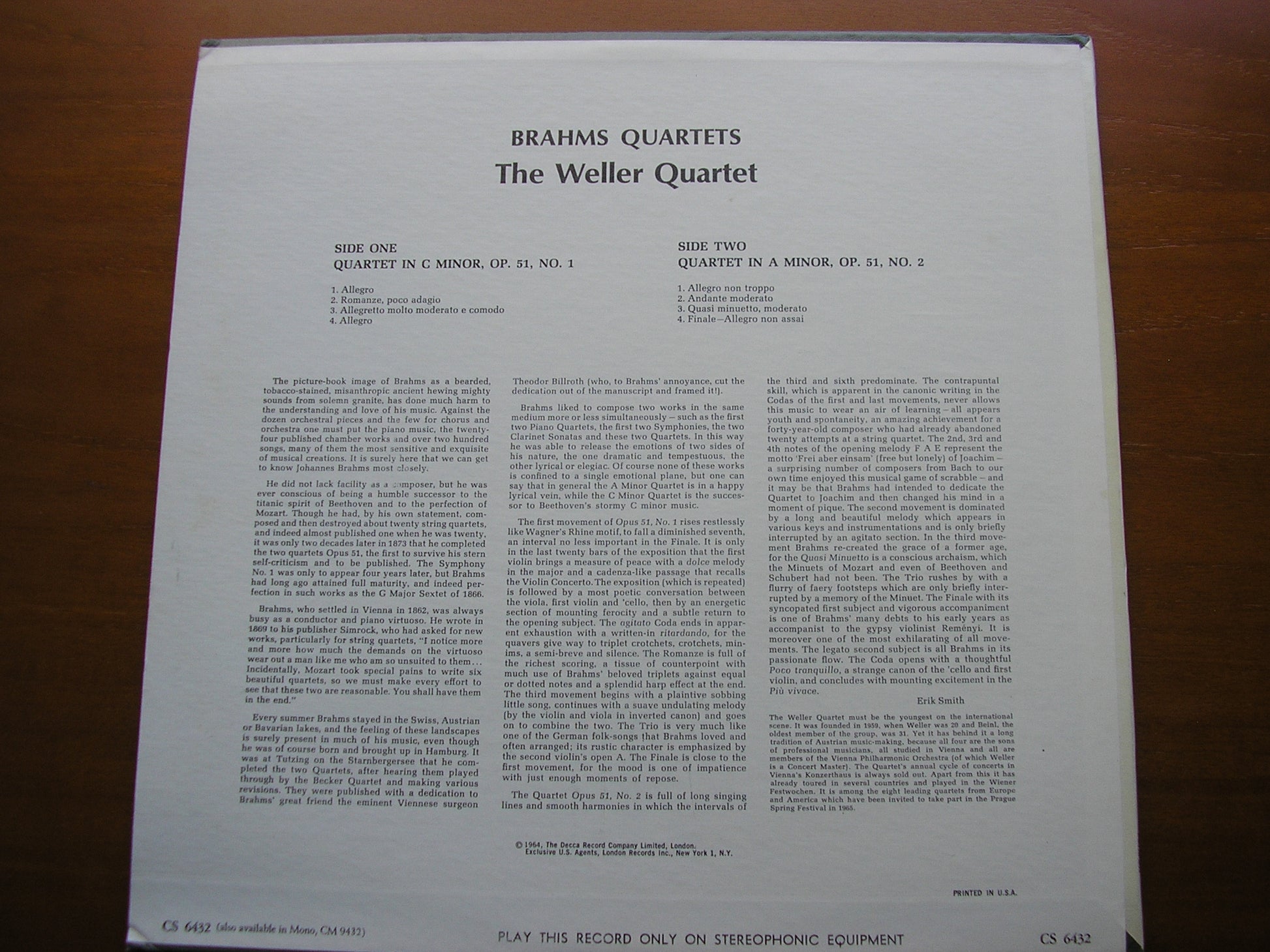 BRAHMS: STRING QUARTETS Nos. 1 & 2 Op. 51 THE WELLER QUARTET CS 6432