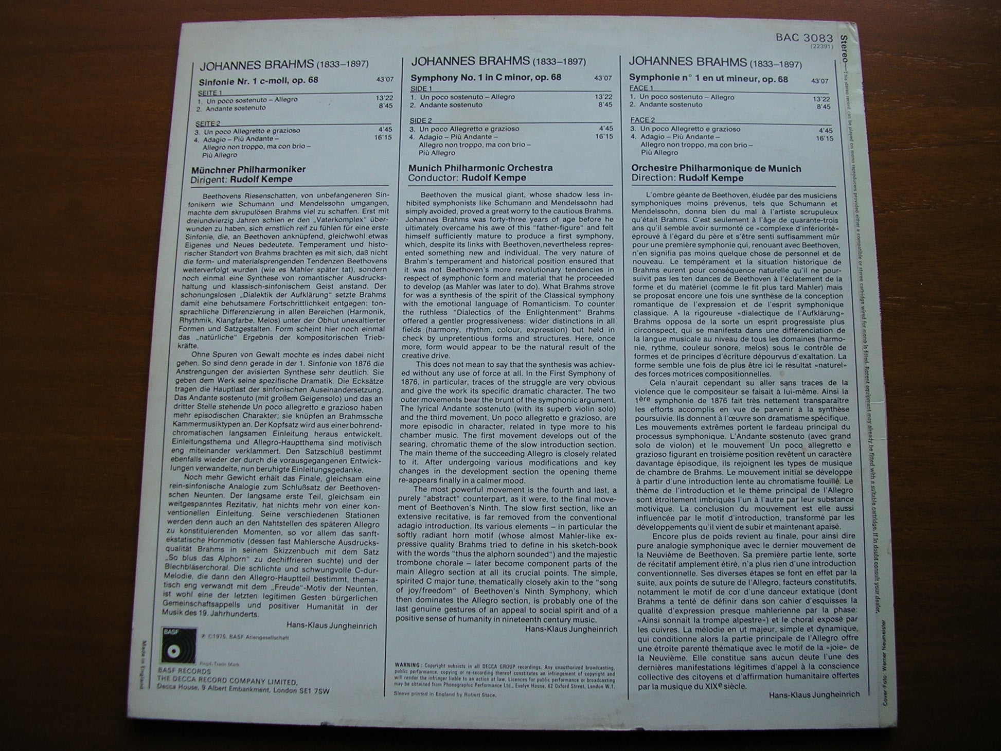 BAC 3083  BRAHMS: SYMPHONY No. 1    RODOLF KEMPE / MUNICH PHILHARMONIC ORCHESTRA