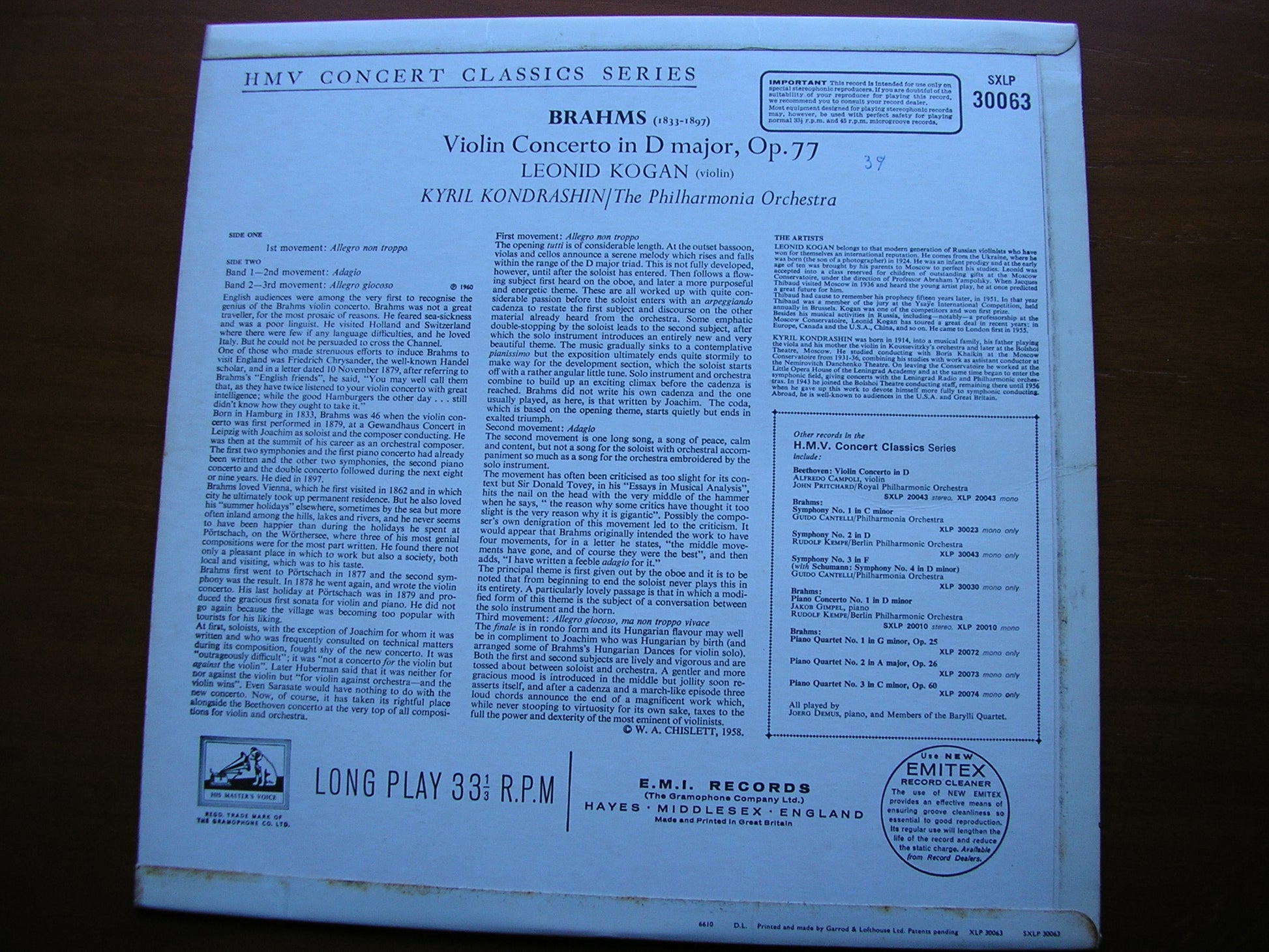 SXLP 30063  BRAHMS: VIOLIN CONCERTO    LEONID KOGAN / PHILHARMONIA ORCHESTRA / KYRIL KONDRASHIN