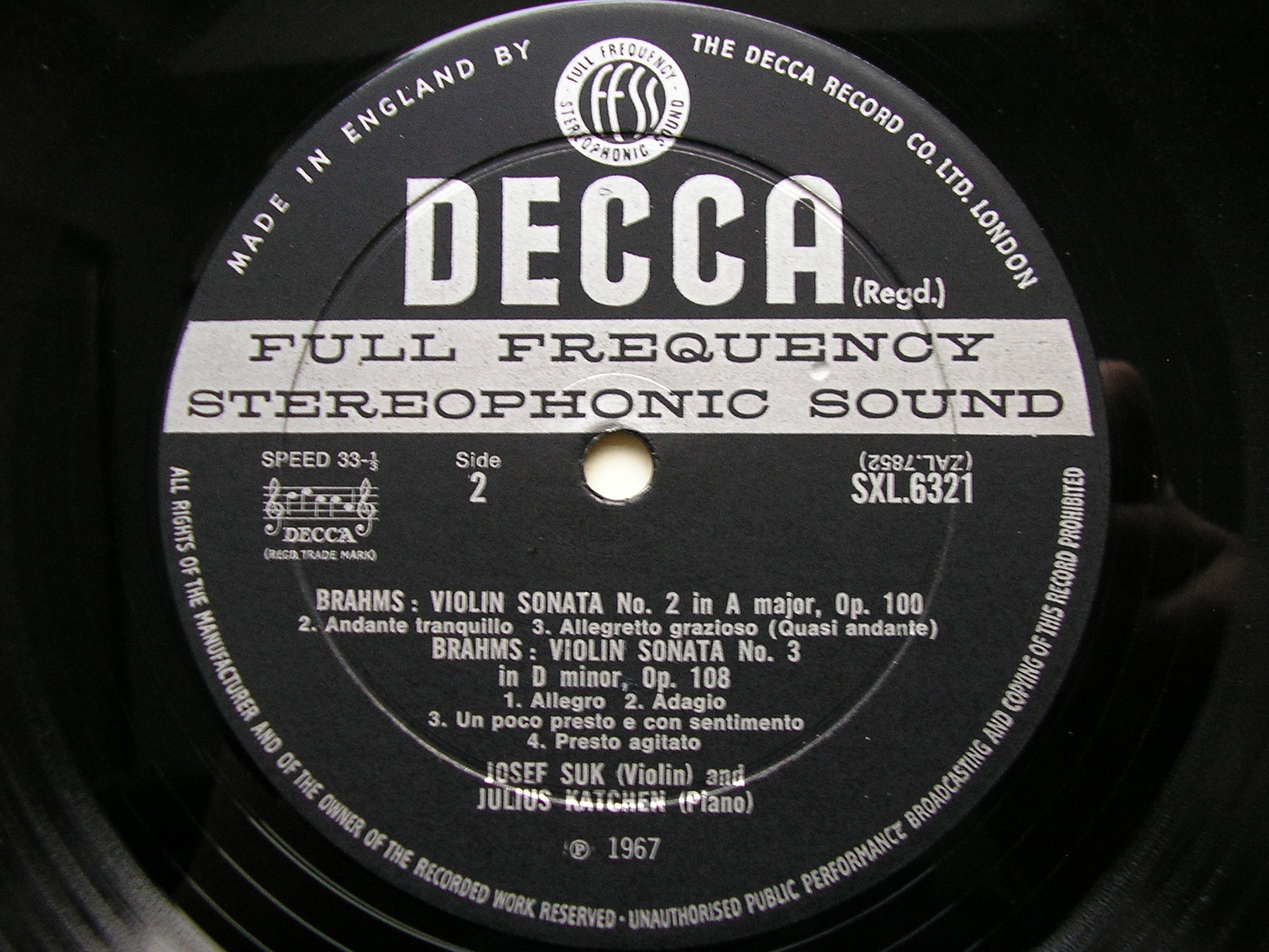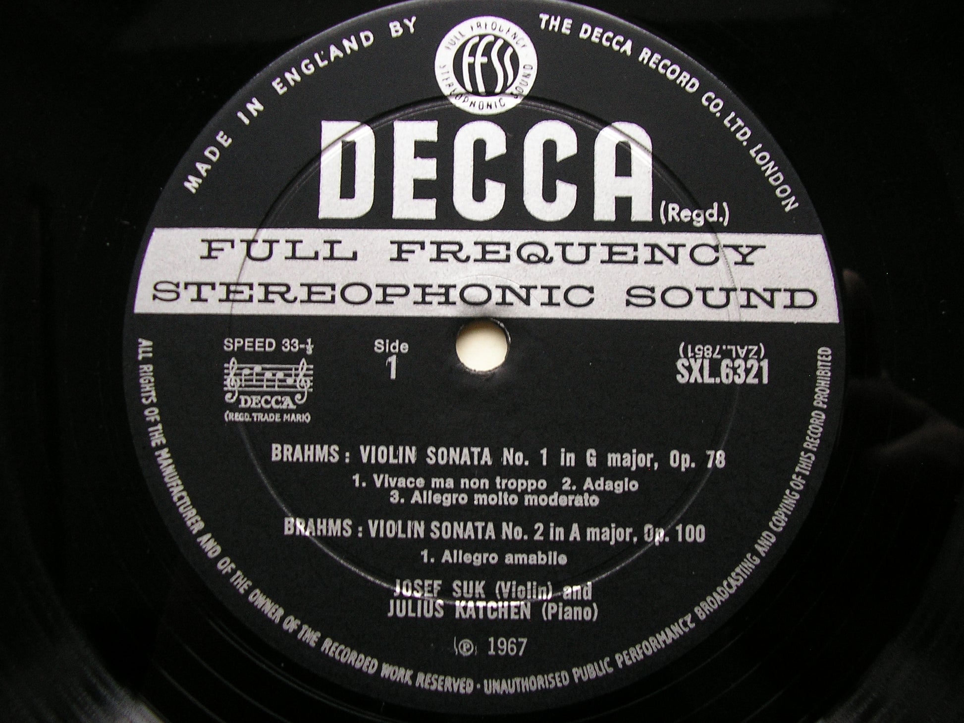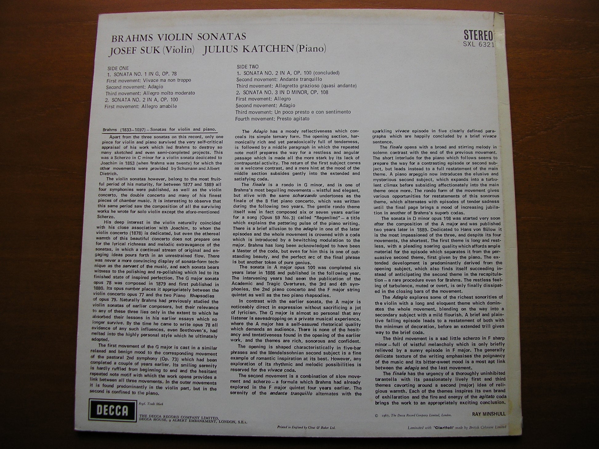 SXL 6321  BRAHMS: VIOLIN SONATAS No. 1 Op. 78 / No. 2 Op. 100 / No. 3 Op. 108   JOSEF SUK / JULIUS KATCHEN