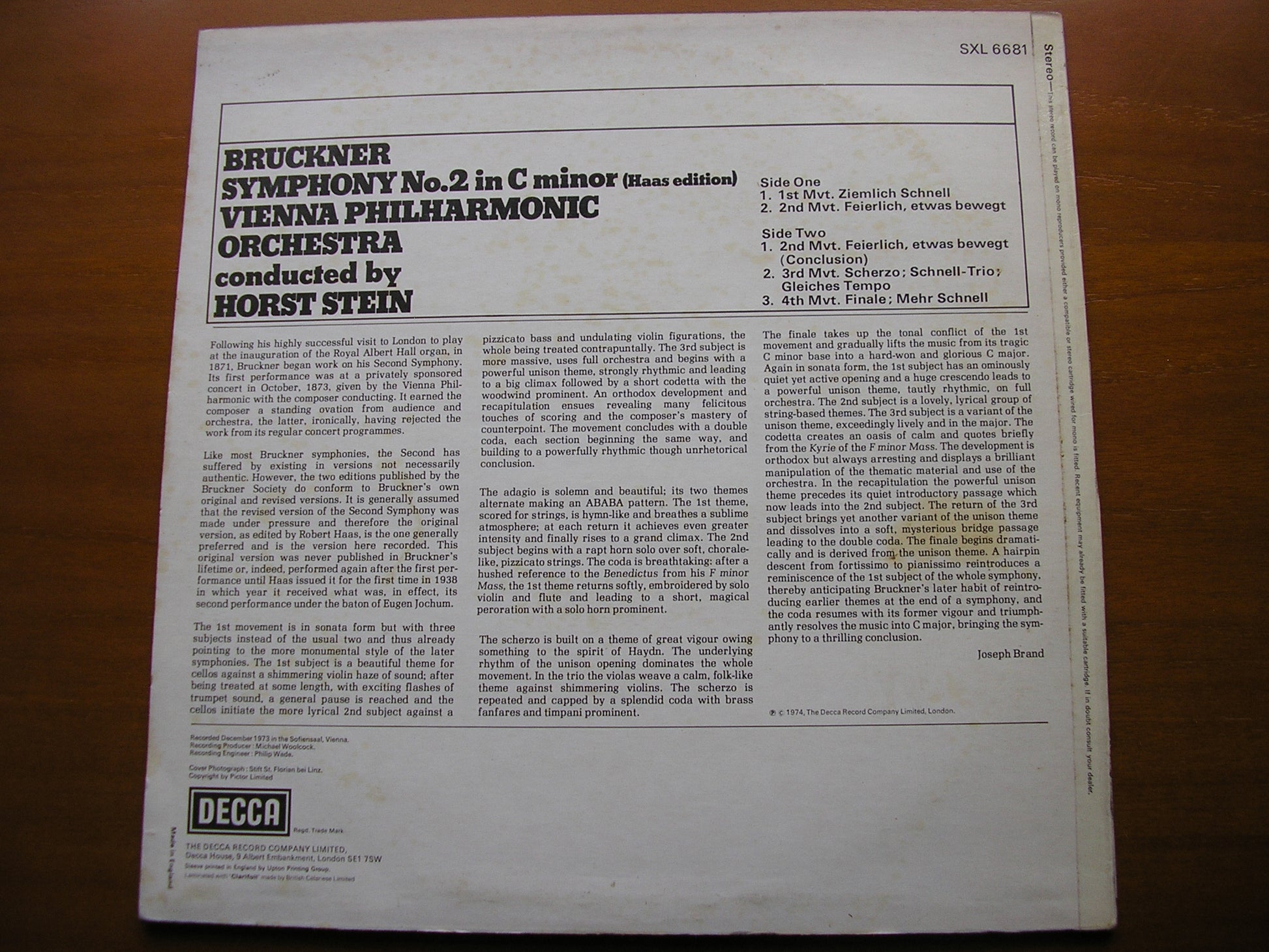 SXL 6681  BRUCKNER: SYMPHONY No. 2      HORST STEIN / VIENNA PHILHARMONIC ORCHESTRA