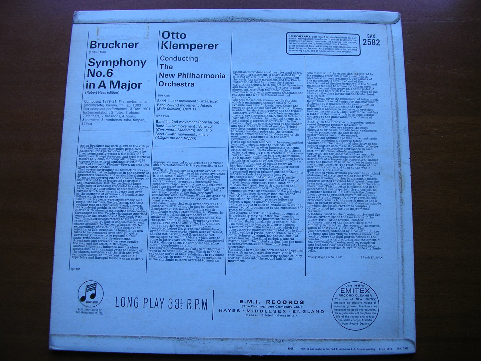 SAX 2582  BRUCKNER: SYMPHONY No. 6     OTTO KLEMPERER / NEW PHILHARMONIA ORCHESTRA