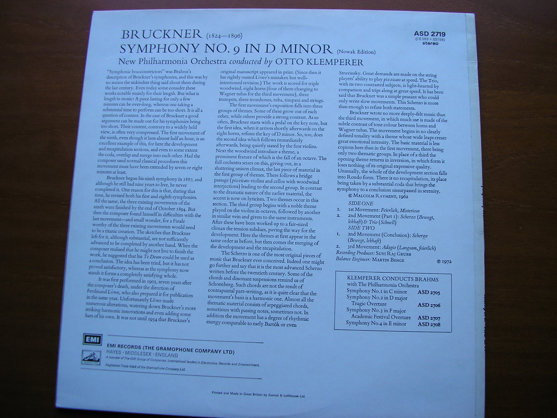 ASD 2719  BRUCKNER: SYMPHONY No. 9     OTTO KLEMPERER / NEW PHILHARMONIA ORCHESTRA