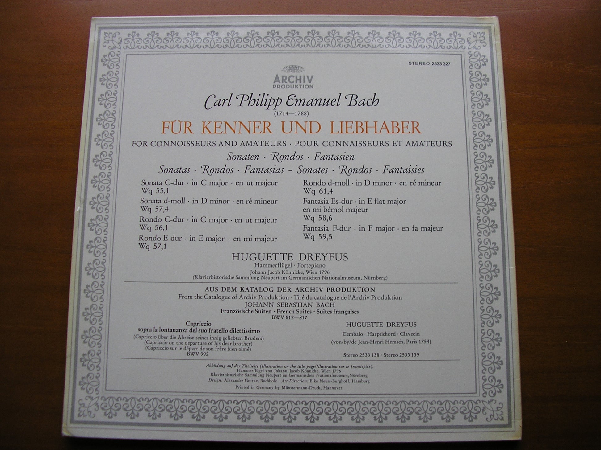 2533 327  C P E BACH: SONATAS / RONDOS / FANTASIAS FOR CONNOISSEURS & AMATEURS         HUGUETTE DREYFUS, fortepiano