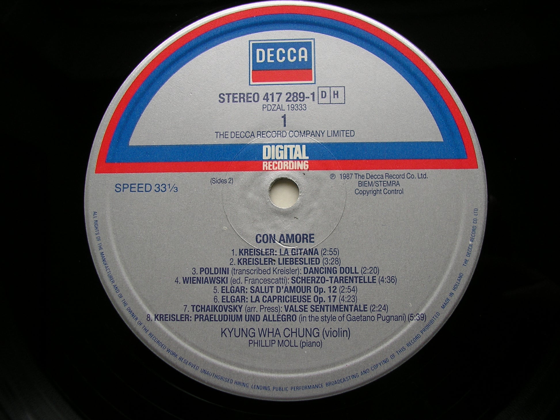 417 289  CON AMORE: Brahms / Kreisler / Elgar / Debussy / Tchaikovsky / Chopin / Ysaye / Saint-Saens / Gossec / Wieniawski     KYUNG WHA CHUNG / PHILLIP MOLL piano