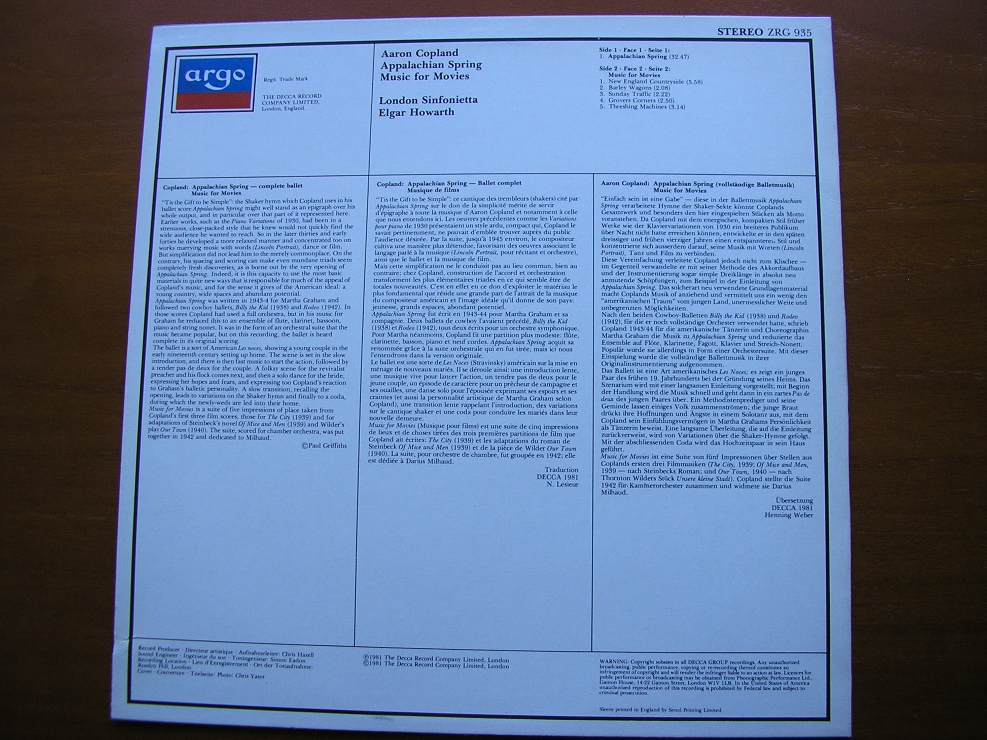COPLAND: APPALACHIAN SPRING / MUSIC FOR MOVIES HOWARTH / LONDON SINFONIETTA ZRG 935