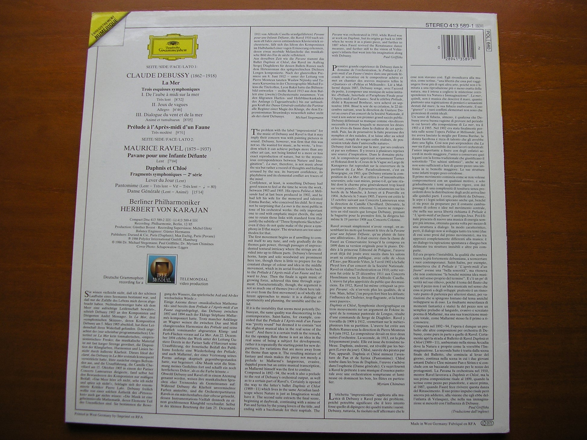 413 589  DEBUSSY: LA MER / PRELUDE / RAVEL: PAVANE / DAPHNIS & CHLOE Suite No. 2  HERBERT VON KARAJAN / BERLIN PHILHARMONIC ORCHESTRA
