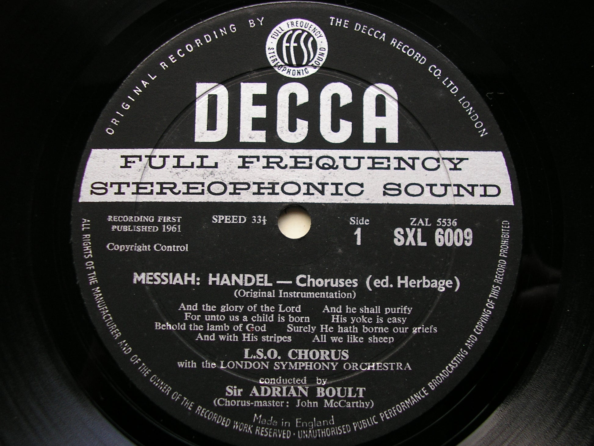 SXL 6009 HANDEL: MESSIAH Choruses LONDON SYMPHONY CHOIR & ORCHESTRA SIR ADRIAN BOULT ED 1