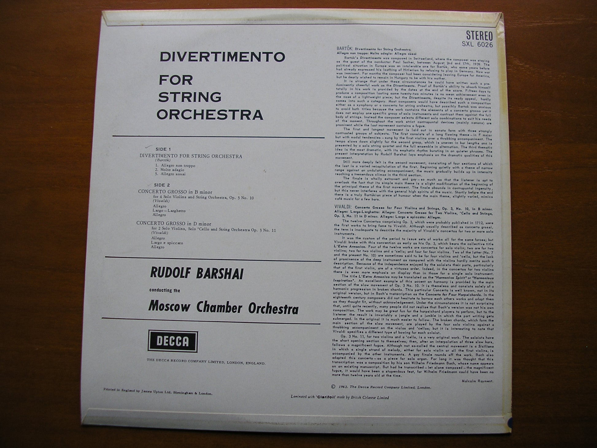 SXL 6026 BARTOK: DIVERTIMENTO / VIVALDI: CONCERTI GROSSI Nos. 10 & 11 BARSHAI / MOSCOW CHAMBER ORCHESTRA ED1