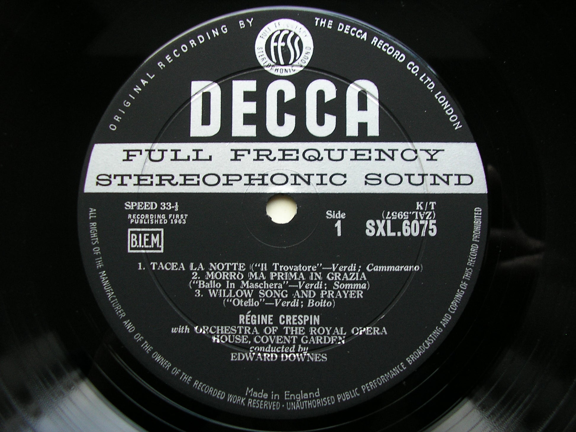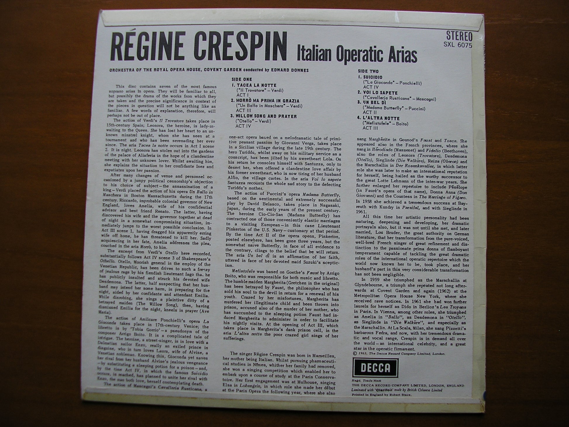 SXL 6075 VERDI / PUCCINI / MASCAGNI / BOITO / PONCHIELLI: OPERA ARIAS       REGINE CRESPIN / ORCHESTRA OF THE ROYAL OPERA HOUSE COVENT GARDEN / EDWARD DOWNES