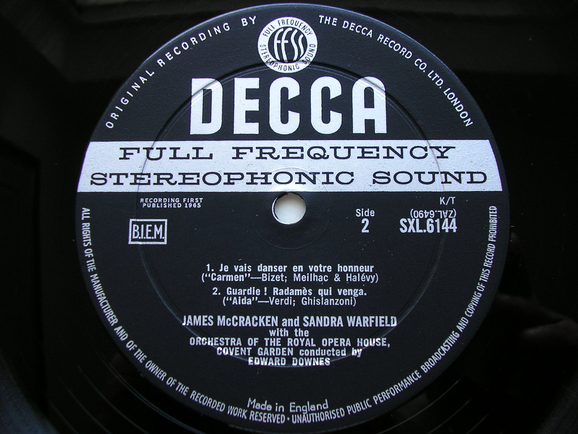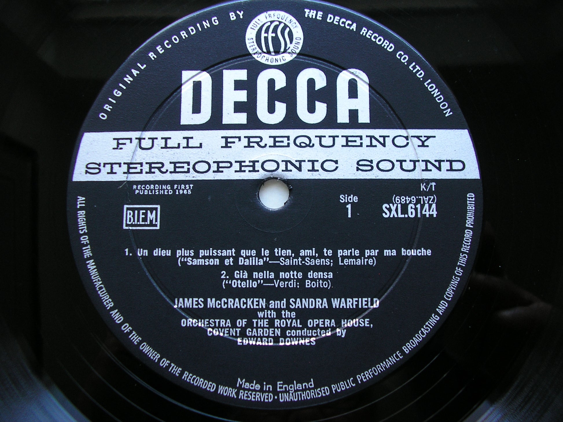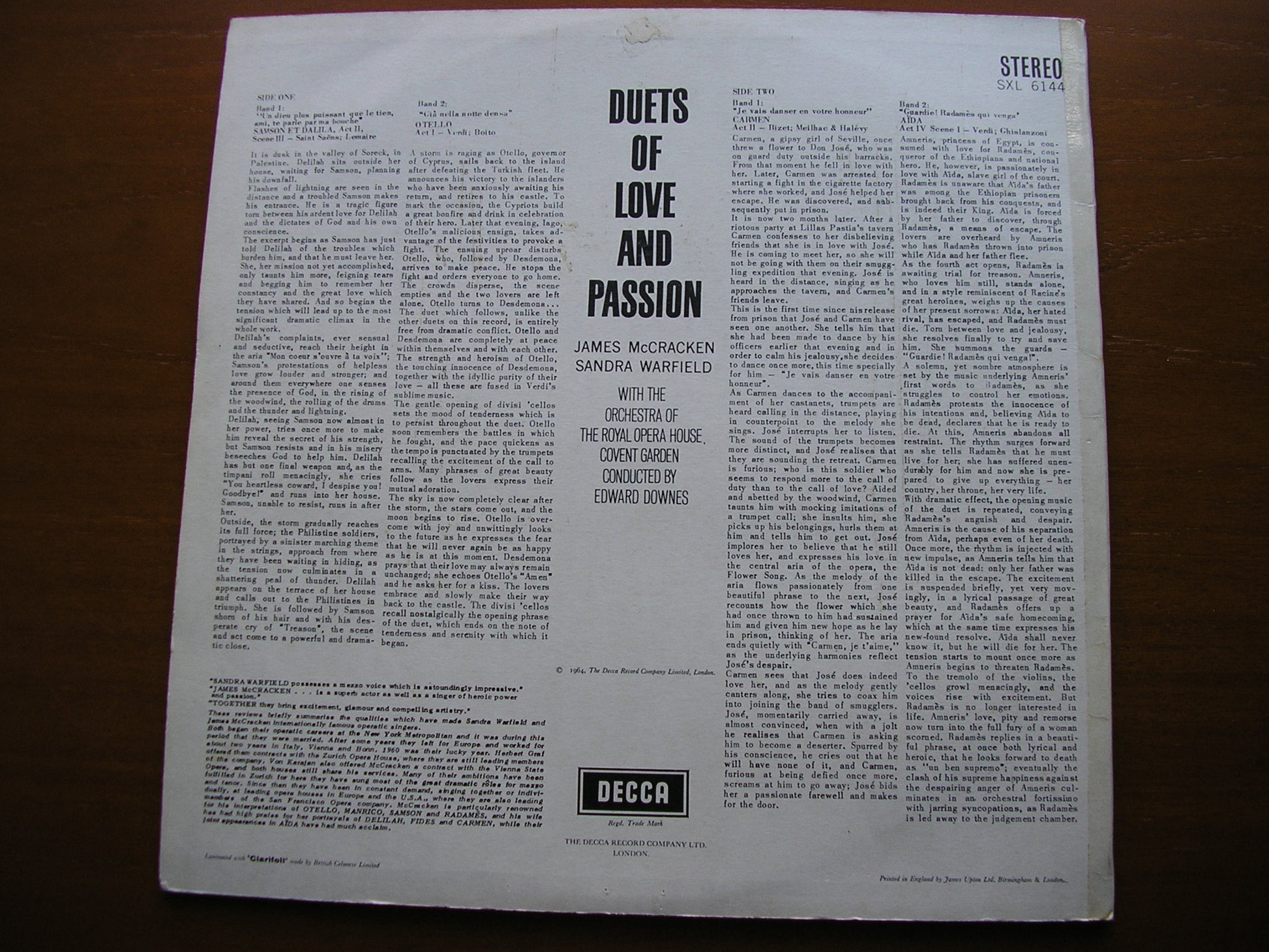 SXL 6144  OPERA DUETS: VERDI 'Aida' & 'Otello' / SAINT - SAENS 'Samson & Dalila' / BIZET 'Carmen'     JAMES McCRACKEN / SANDRA WARFIELD / ORCHESTRA OF THE ROYAL OPERA HOUSE COVENT GARDEN / EDWARD DOWNES
