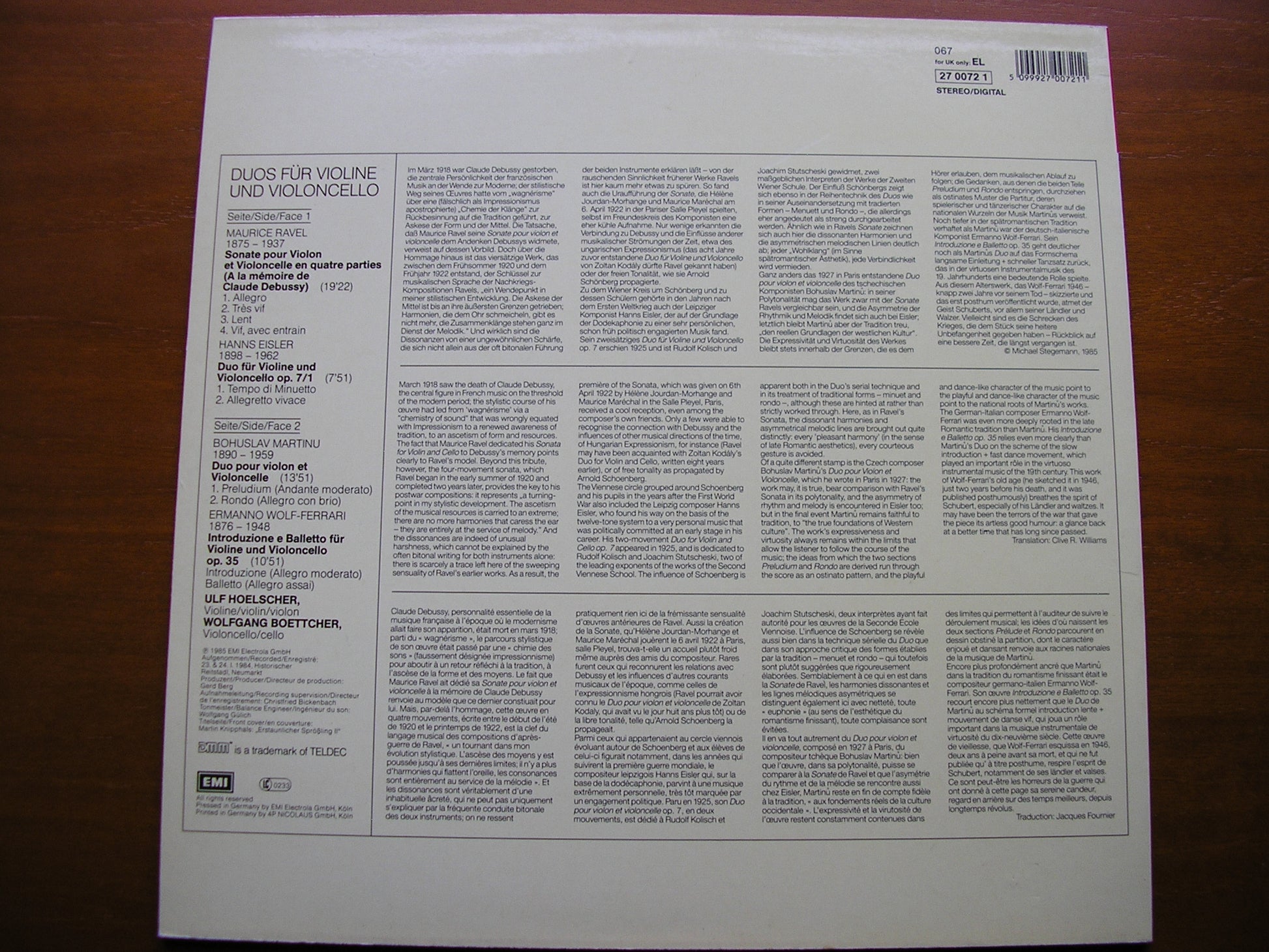 DUOS FOR VIOLIN & CELLO: RAVEL Sonata / EISLER Duo Op. 7 / MARTINU Duo / WOLF-FERRARI Introduction & Ballet Op. 35   ULF HOELSCHER / WOLFGANG BOETTCHER