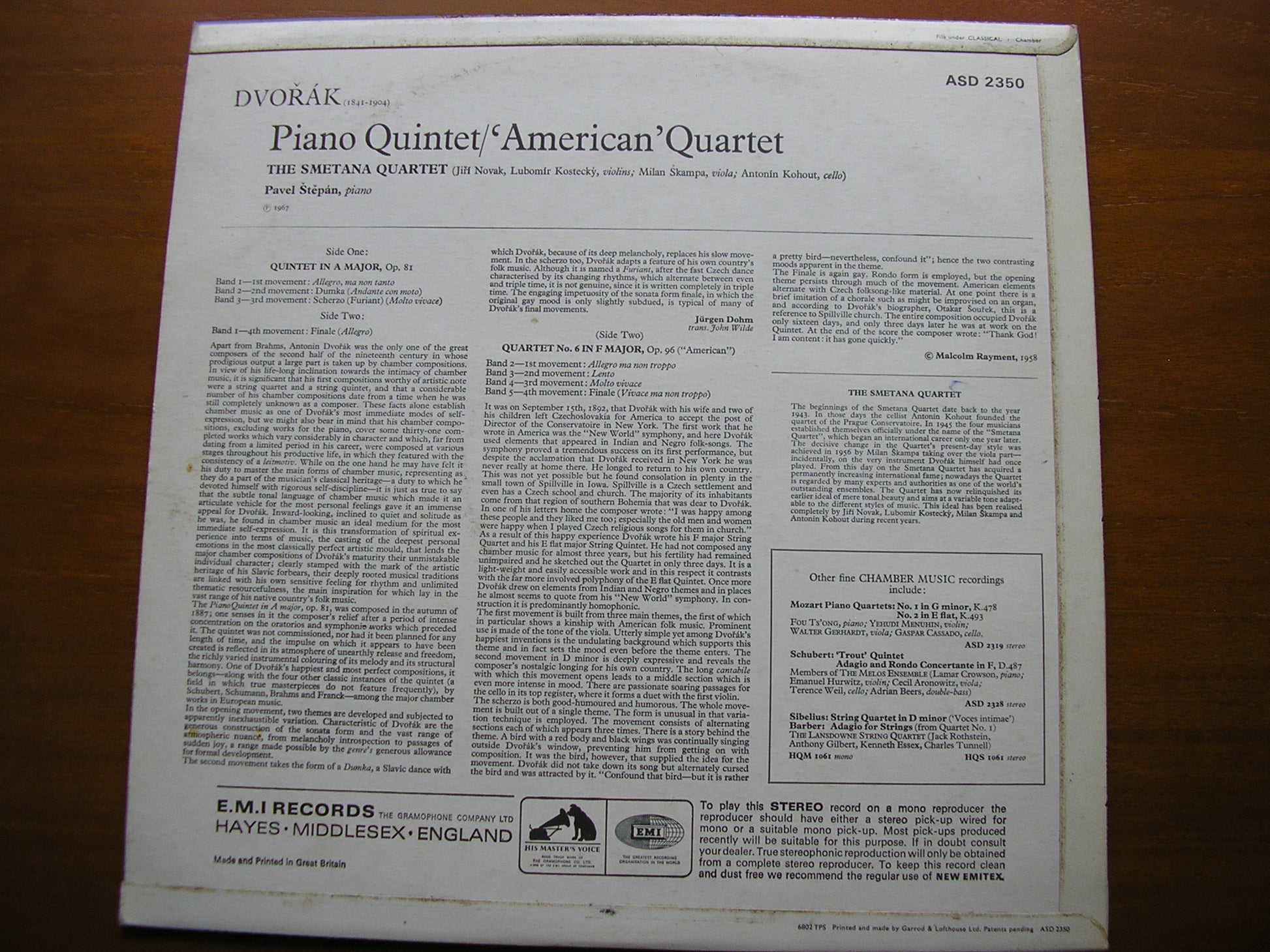 ASD 2350  DVORAK: PIANO QUINTET Op. 81 / STRING QUARTET No. 6 Op. 96    THE SMETANA QUARTET / PAVEL STEPAN, piano