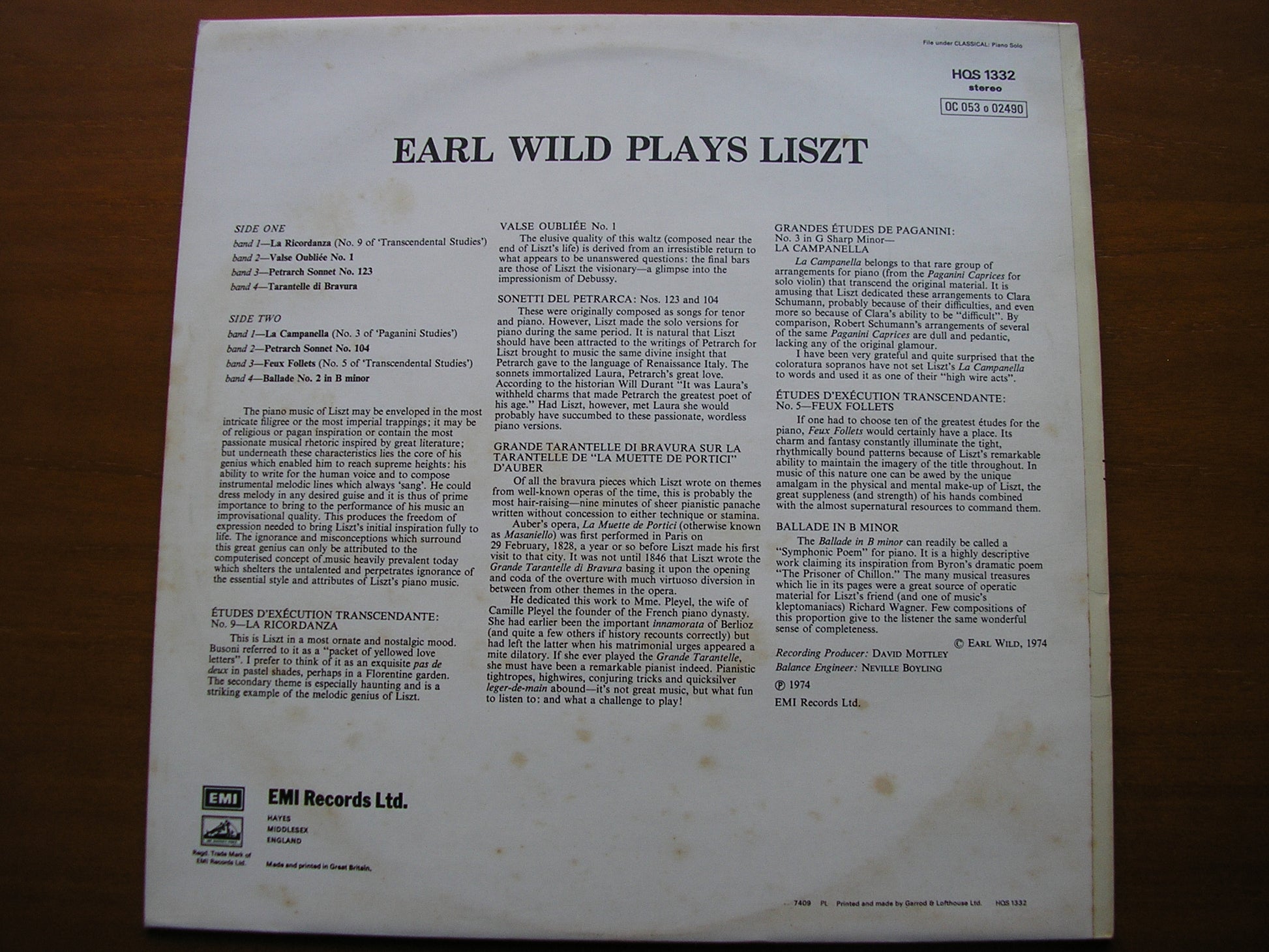 HQS 1332  LISZT:  TWO PETRARCH SONNETS / TWO TRANSCENDENTAL STUDIES / VALSE OUBLIEE / BALLADE / FEUX FOLLETS / TARANTELLE DI BRAVURA      EARL WILD