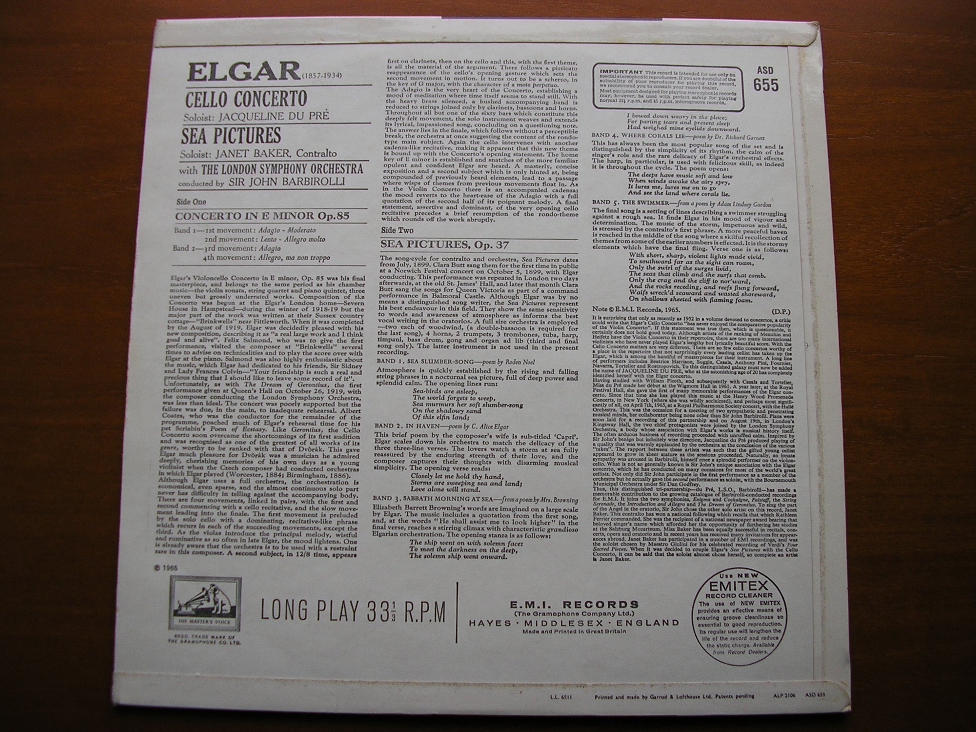ASD 655  ELGAR: CELLO CONCERTO / SEA PICTURES    JACQUELINE DU PRE / JANET BAKER / LONDON SYMPHONY ORCHESTRA / SIR JOHN BARBIROLLI