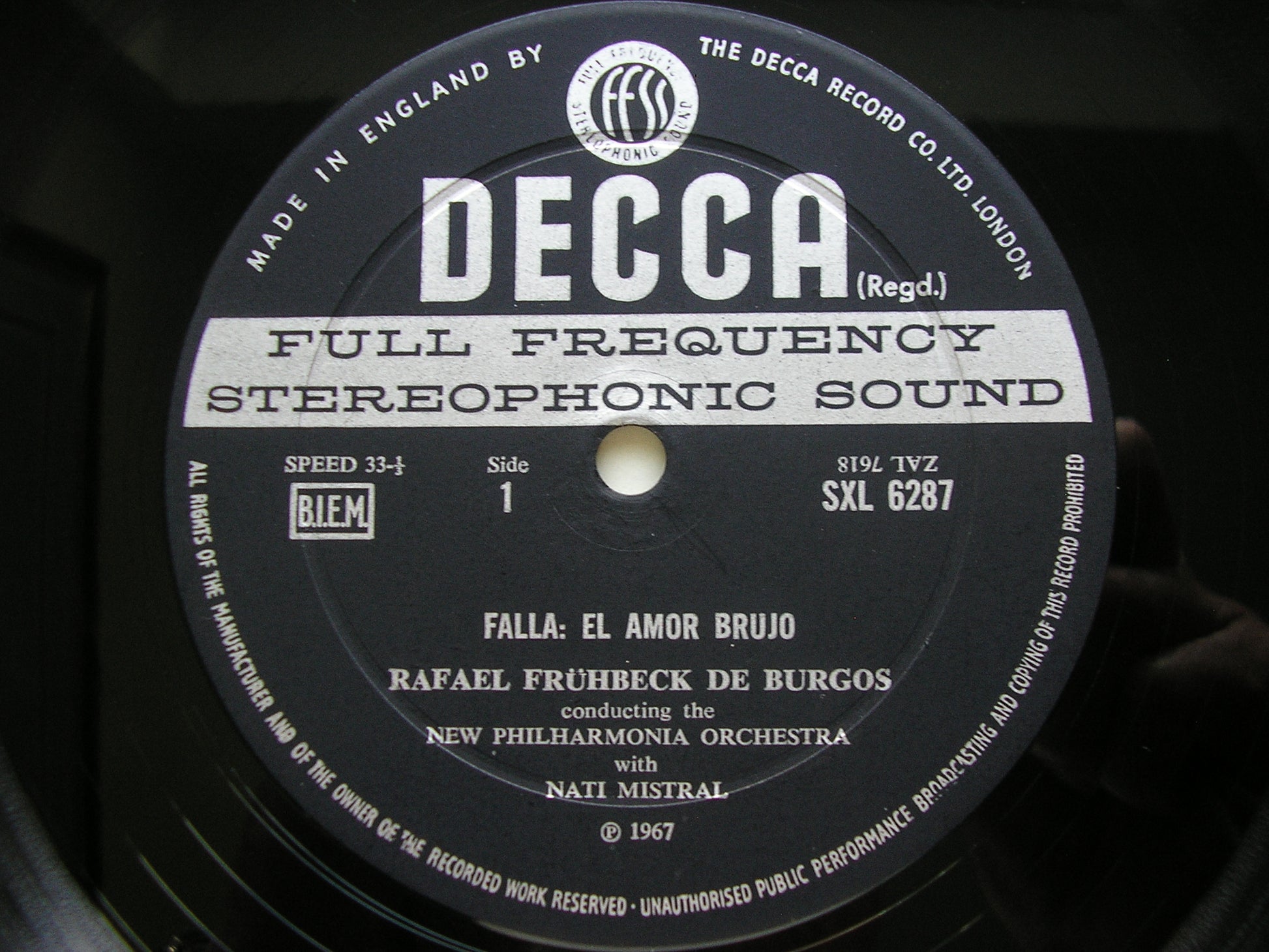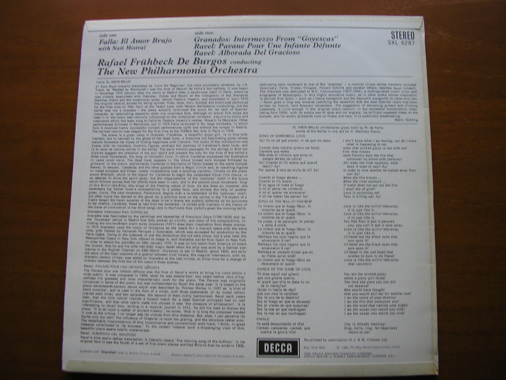 SXL 6287  FALLA: EL AMOR BRUJO / RAVEL: ALBORADA DEL GRACIOSO / PAVANE / GRANADOS: INTERMEZZO from 'Goyescas'      MISTRAL / NEW PHILHARMONIA ORCHESTRA / RAFAEL FRUHBECK DE BURGOS