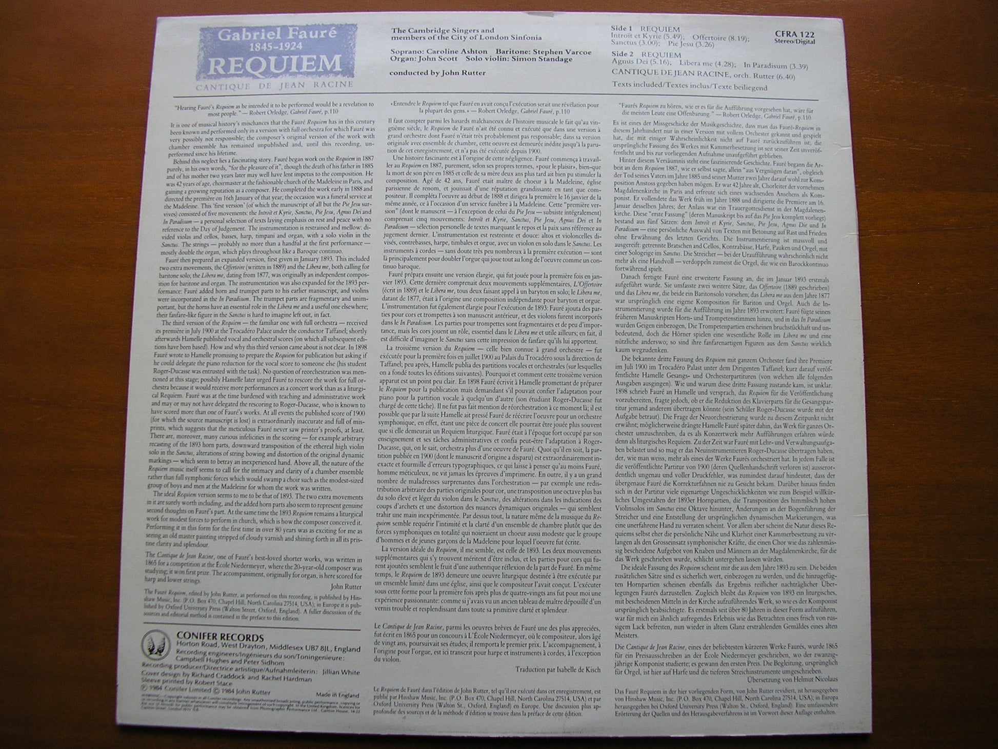 CFRA 122 FAURE: REQUIEM      CAROLINE ASHTON / STEPHEN VARCOE / CAMBRIDGE SINGERS / CITY OF LONDON SINFONIA / JOHN RUTTER