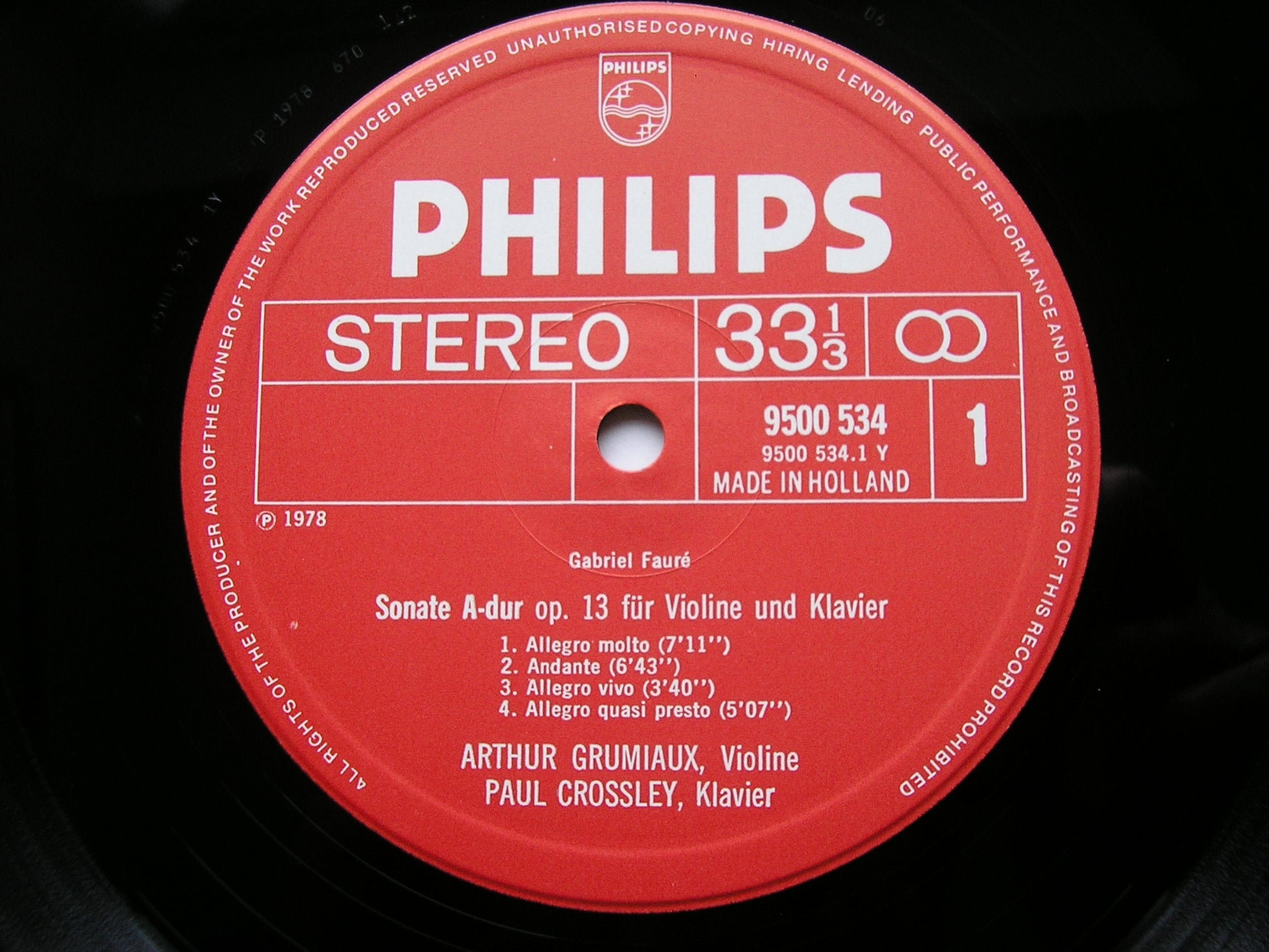 9500 534  FAURE: VIOLIN SONATA in A Op. 13 / VIOLIN SONATA in E Op. 108     ARTHUR GRUMIAUX / PAUL CROSSLEY