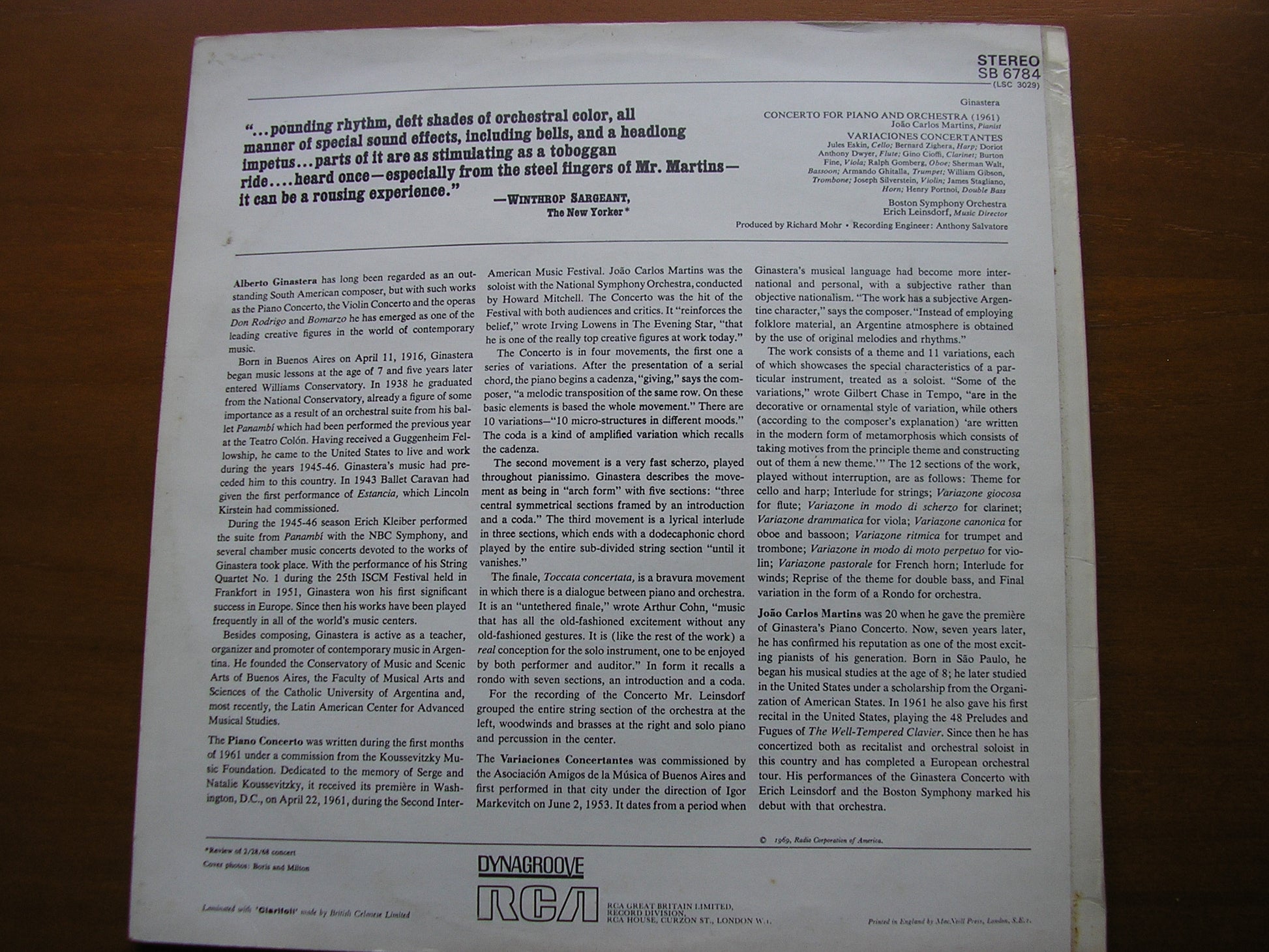 SB 6784  GINASTERA: PIANO CONCERTO / VARIACIONES CONCERTANTES     JOAO CARLOS MARTINS / BOSTON SYMPHONY ORCHESTRA / ERICH LEINSDORF