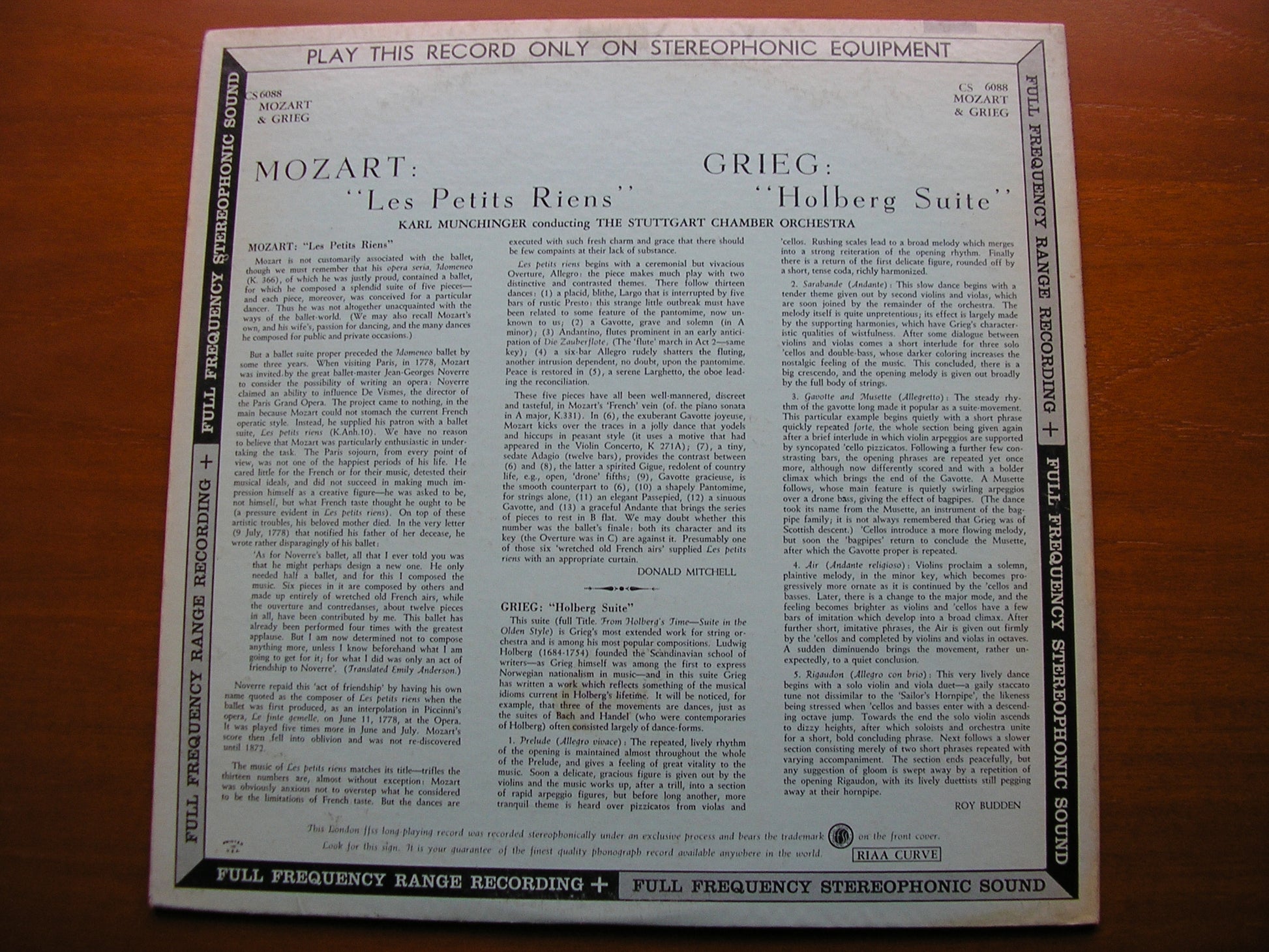 GRIEG: HOLBERG SUITE / MOZART: LES PETITS RIENS MUNCHINGER / STUTTGART CHAMBER ORCHESTRA CS 6088