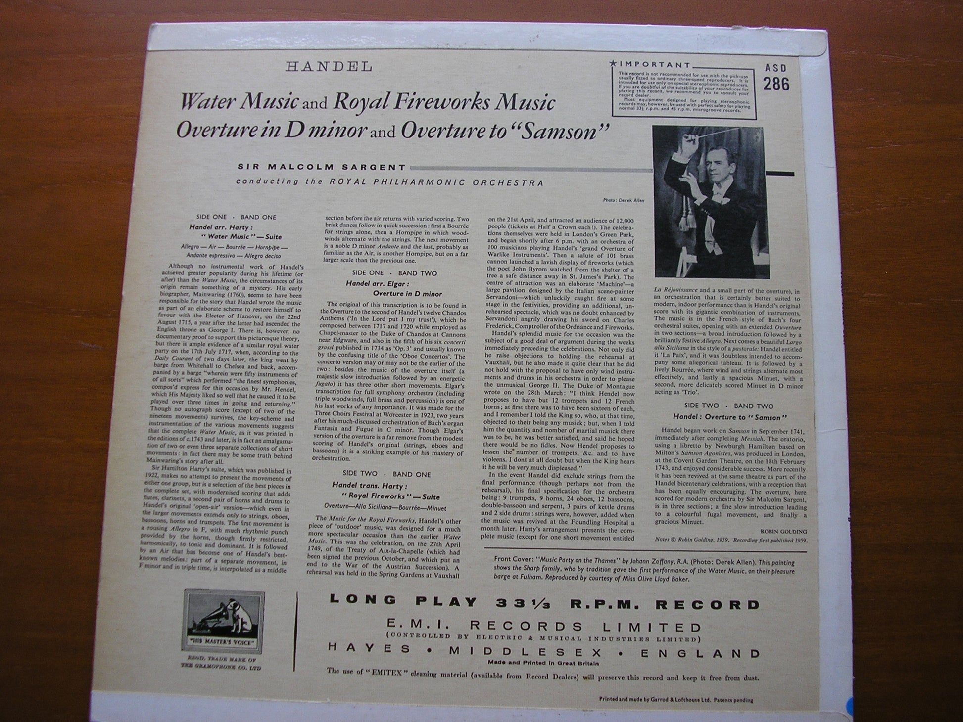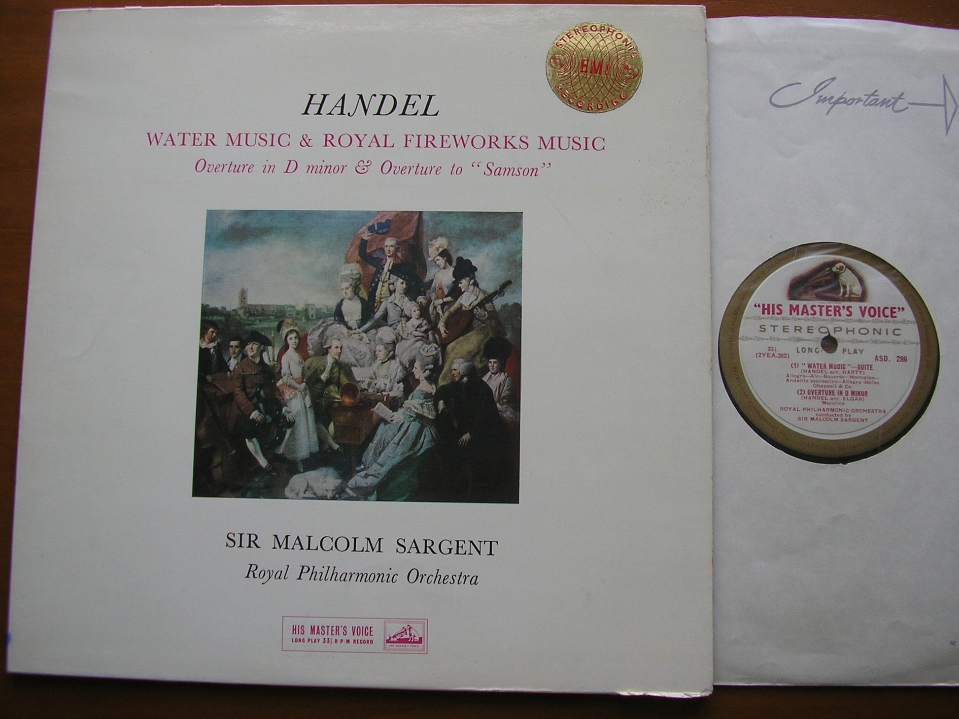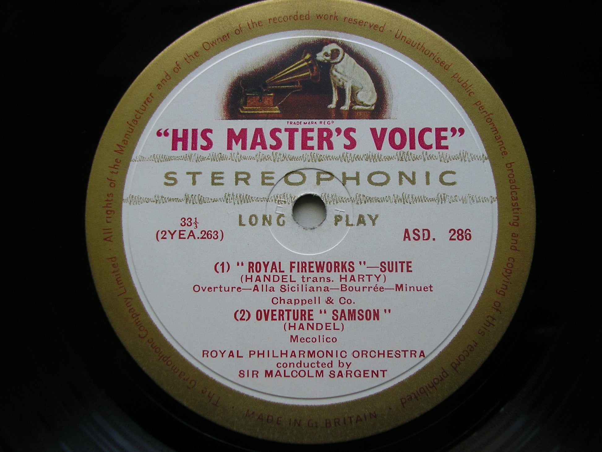 ASD 286  HANDEL: WATER MUSIC / ROYAL FIREWORKS MUSIC / OVERTURES in D minor and to 'Samson'   SIR MALCOLM SARGENT / ROYAL PHILHARMONIC ORCHESTRA