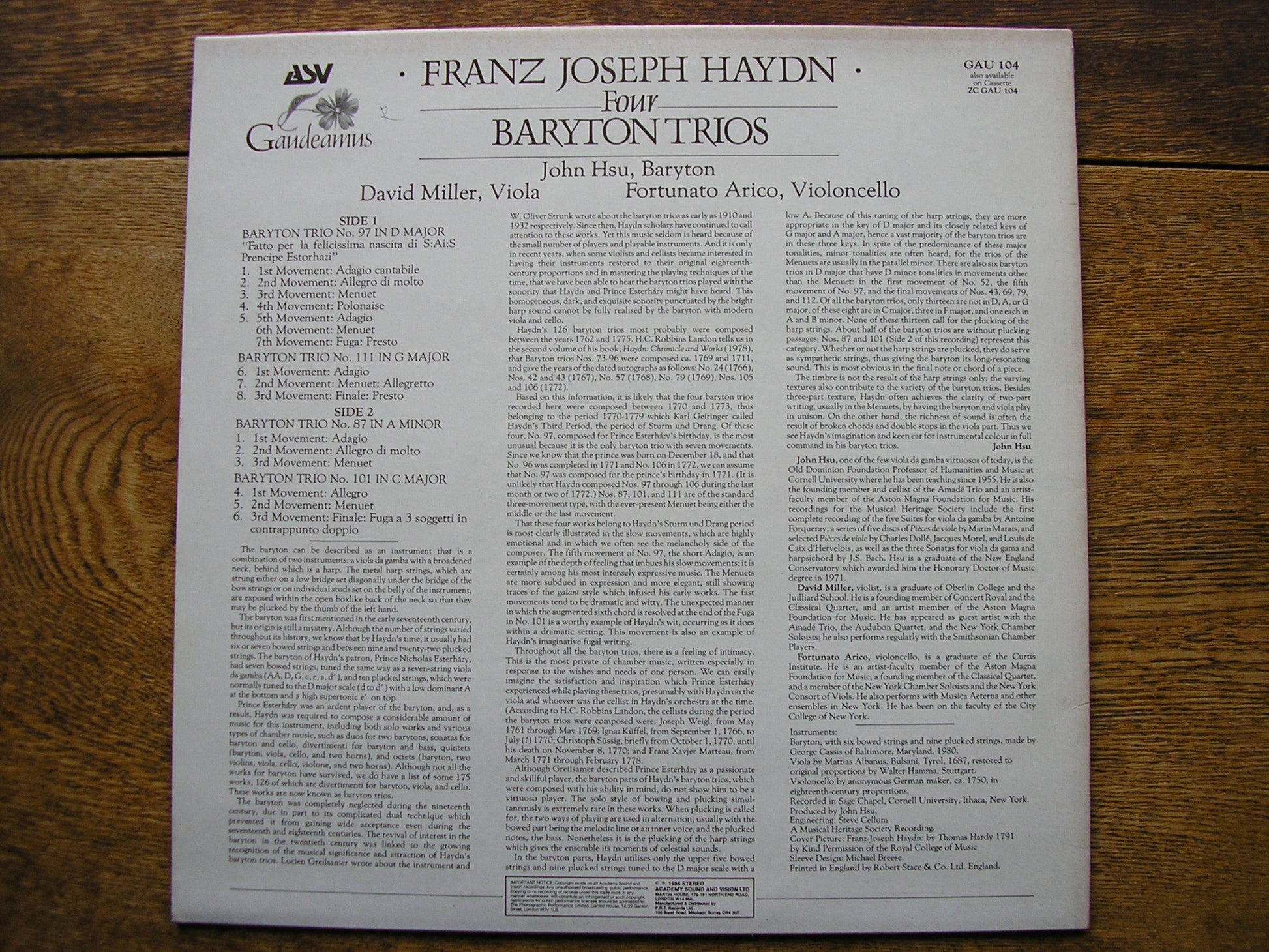 GAU 104  HAYDN: FOUR BARYTON TRIOS   JOHN HSU / DAVID MILER / FORTUNATO ARICO