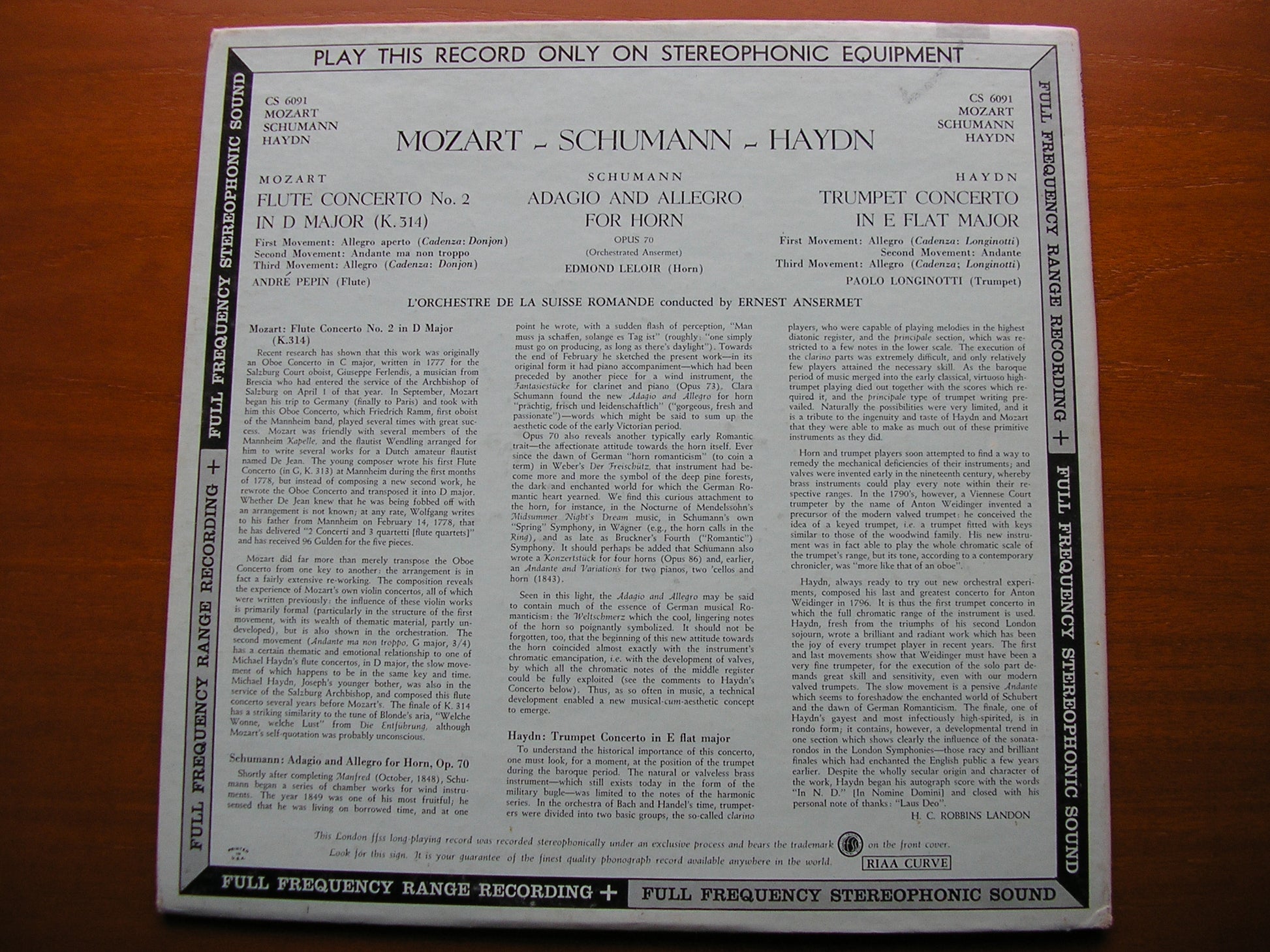 CS 6091  HAYDN: TRUMPET CONCERTO / MOZART: FLUTE CONCERTO K314 / SCHUMANN: ADAGIO & ALLEGRO      ERNEST ANSERMET / SUISSE ROMANDE ORCHESTRA