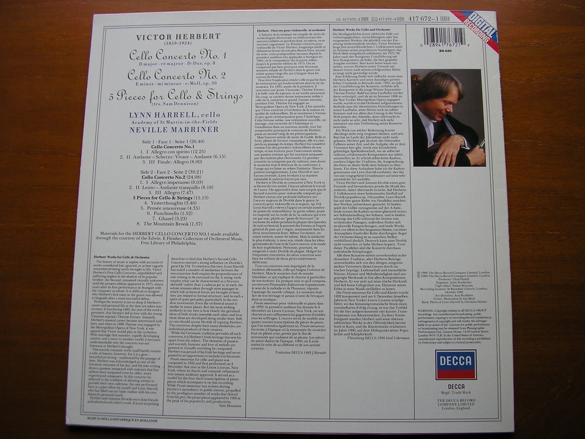 HERBERT: CELLO CONCERTOS LYNN HARRELL / ASMIF / NEVILLE MARRINER 417 672