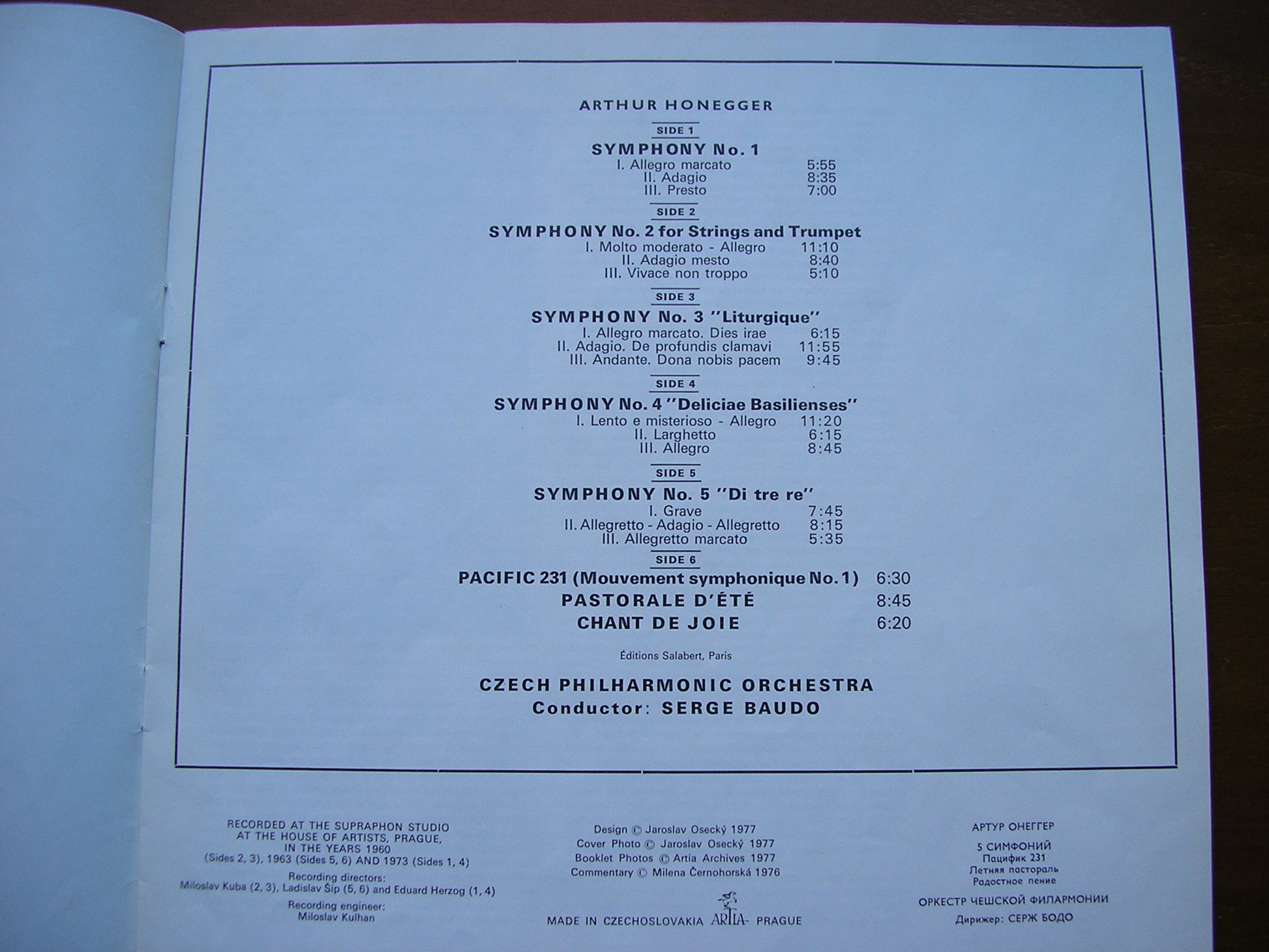 HONEGGER: THE FIVE SYMPHONIES / PACIFIC 231 / PASTORALE D'ETE / CHANT DE JOIE BAUDO / CZECH PHILHARMONIC 3LP 110 1741-3