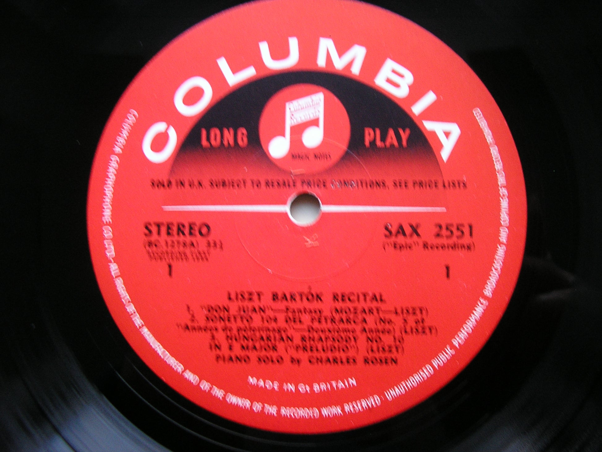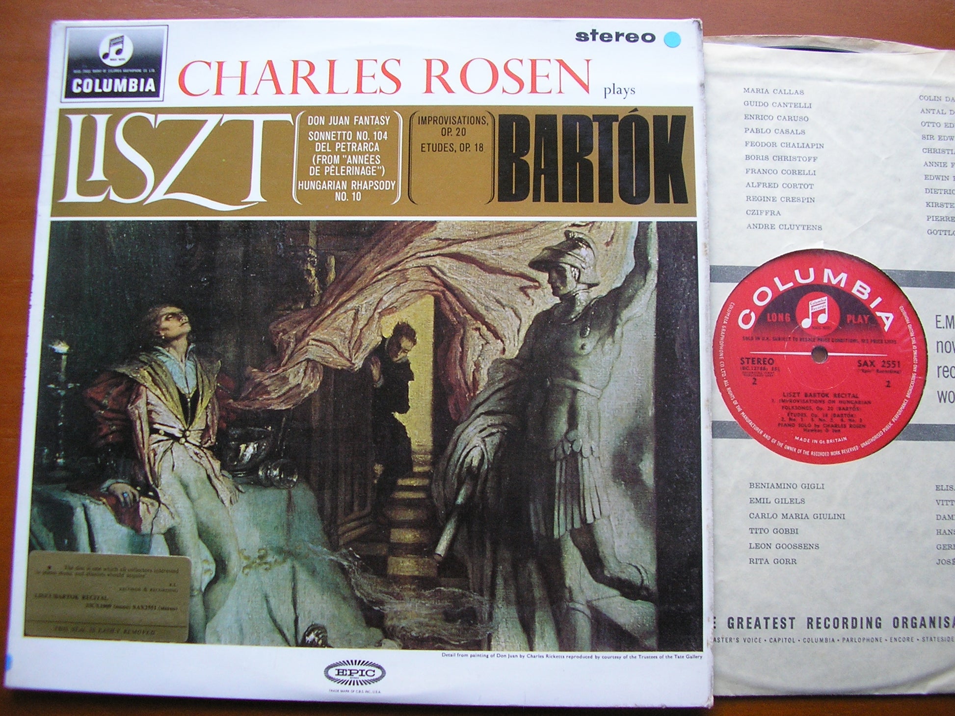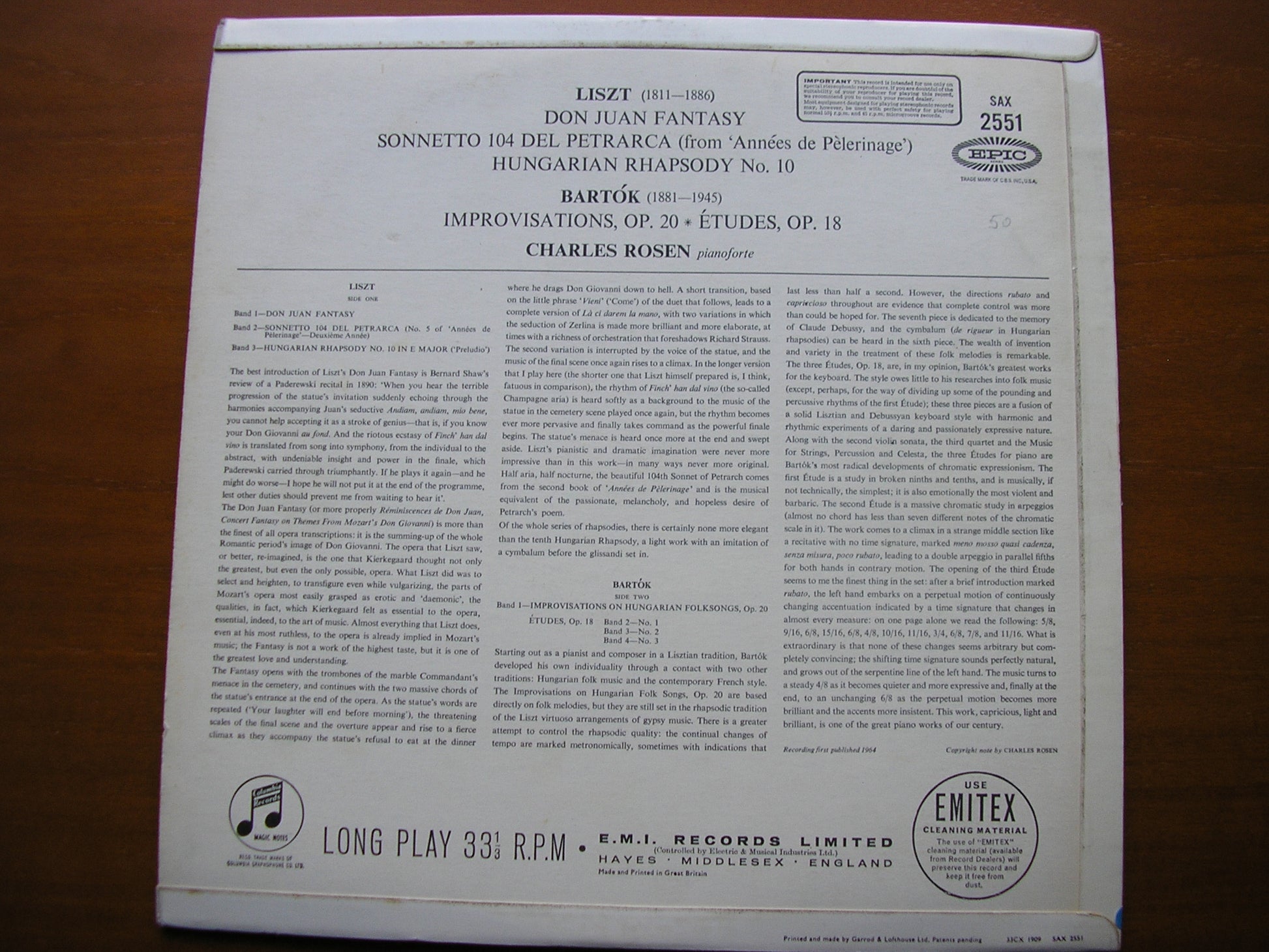SAX 2551  LISZT: DON JUAN FANTASY / HUNGARIAN RHAPSODY No. 10 / PETRARCH SONNET NO. 104  / BARTOK: IMPROVISATIONS Op. 20 / ETUDES Op. 18      CHARLES ROSEN