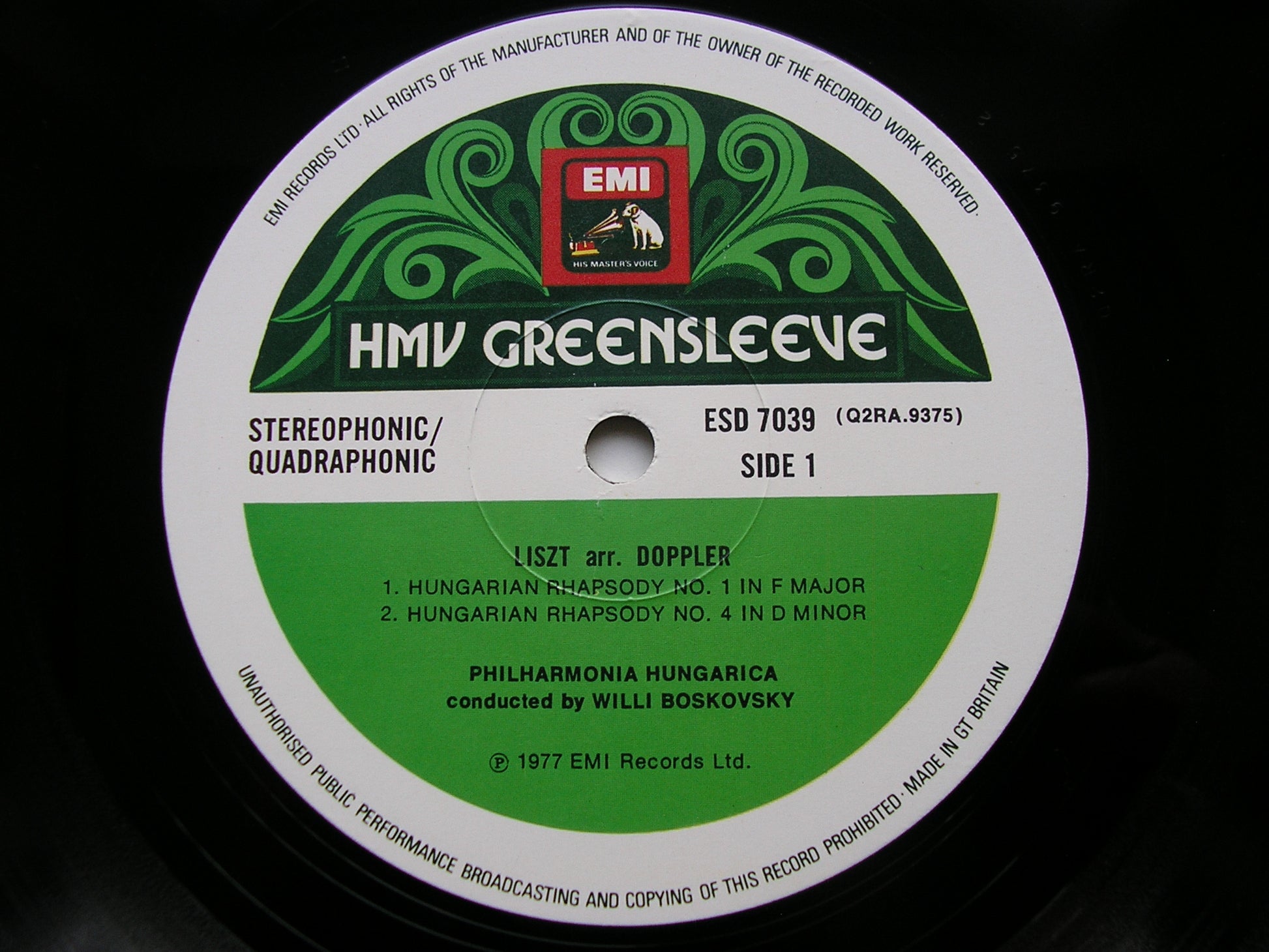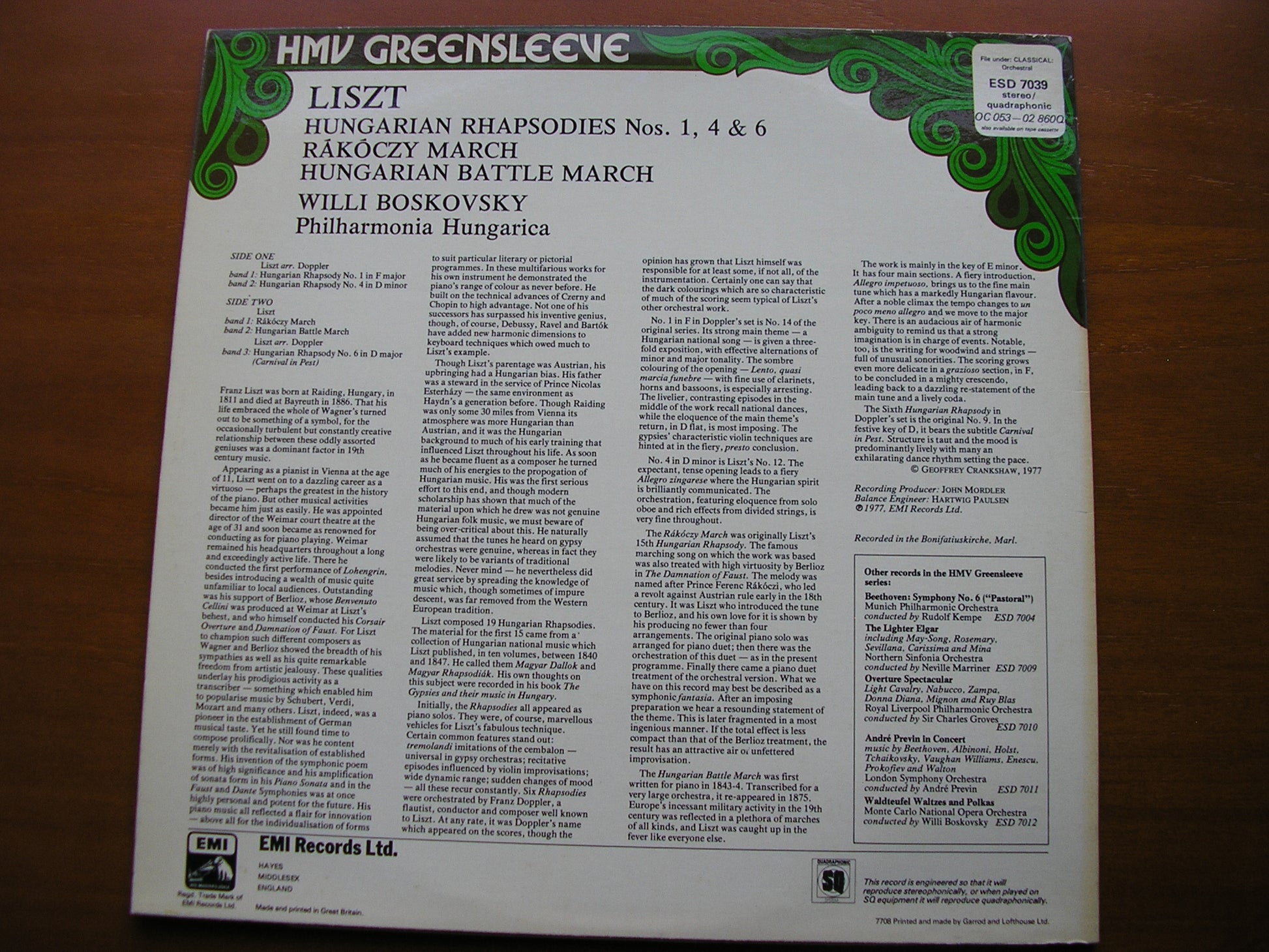 ESD 7039  LISZT: HUNGARIAN RHAPSODIES Nos. 1 / 4 / 6 / RAKOCZY MARCH / HUNGARIAN BATTLE MARCH      WILLI BOSKOVSKY / PHILHARMONIA HUNGARICA