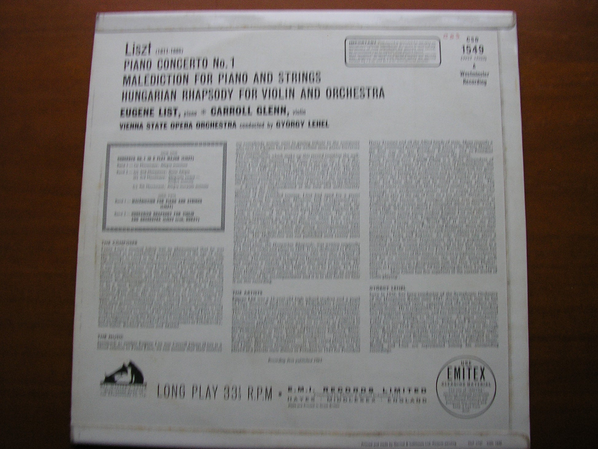 CSD 1549  LISZT: PIANO CONCERTO No. 1 / MALEDICTION / HUNGARIAN RHAPSODY FOR VIOLIN & ORCHESTRA      EUGENE LIST / CARROLL GLENN / VIENNA STATE OPERA ORCHESTRA / GYORGY LEHEL