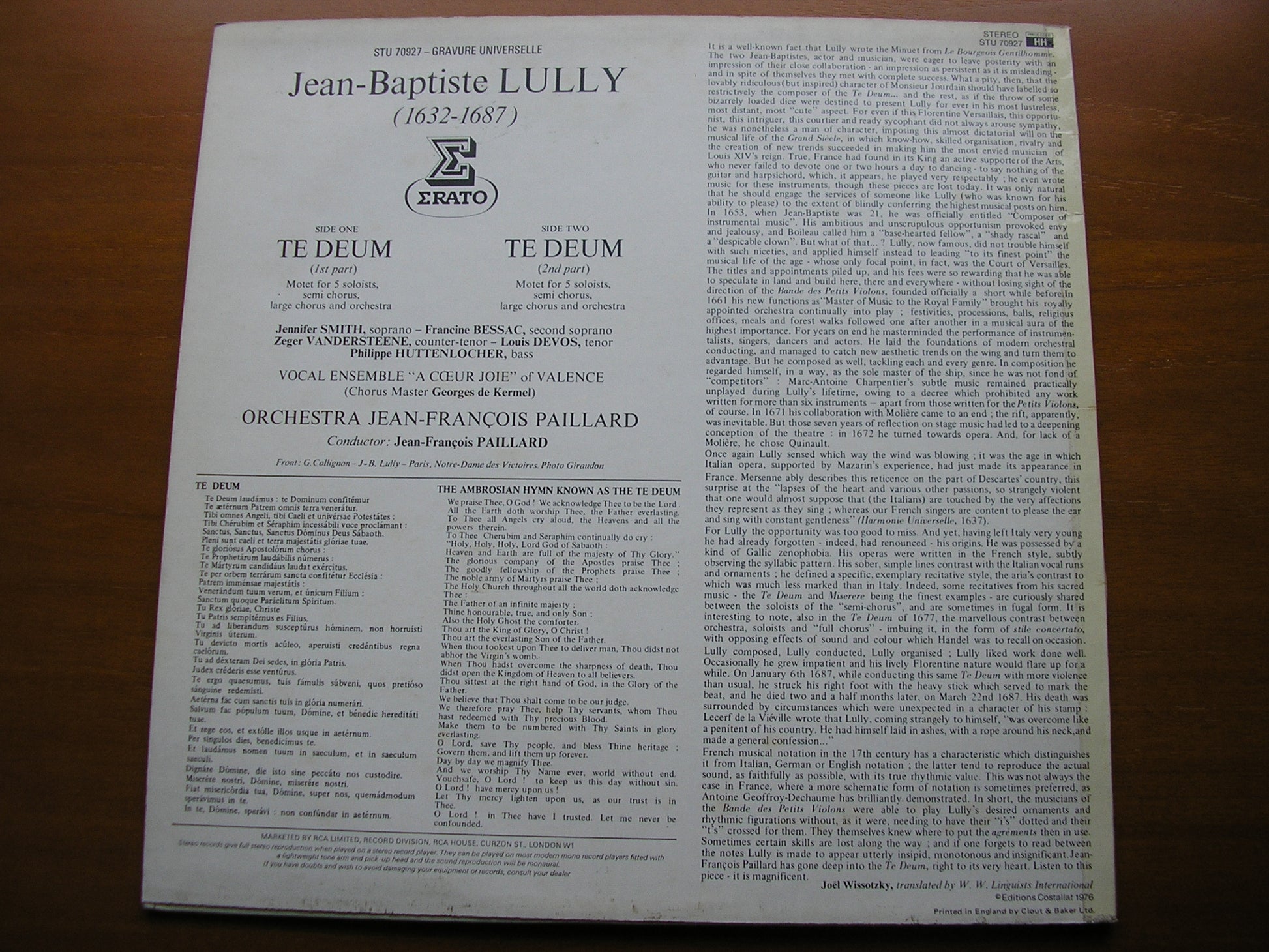 STU 70927  LULLY: TE DEUM    SOLOISTS / JEAN-FRANCOIS PAILLARD ORCHESTRA