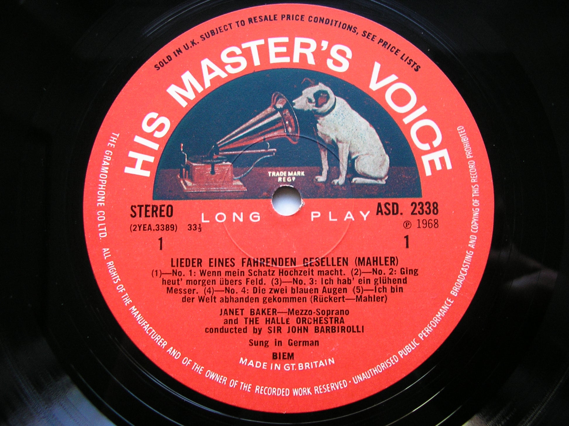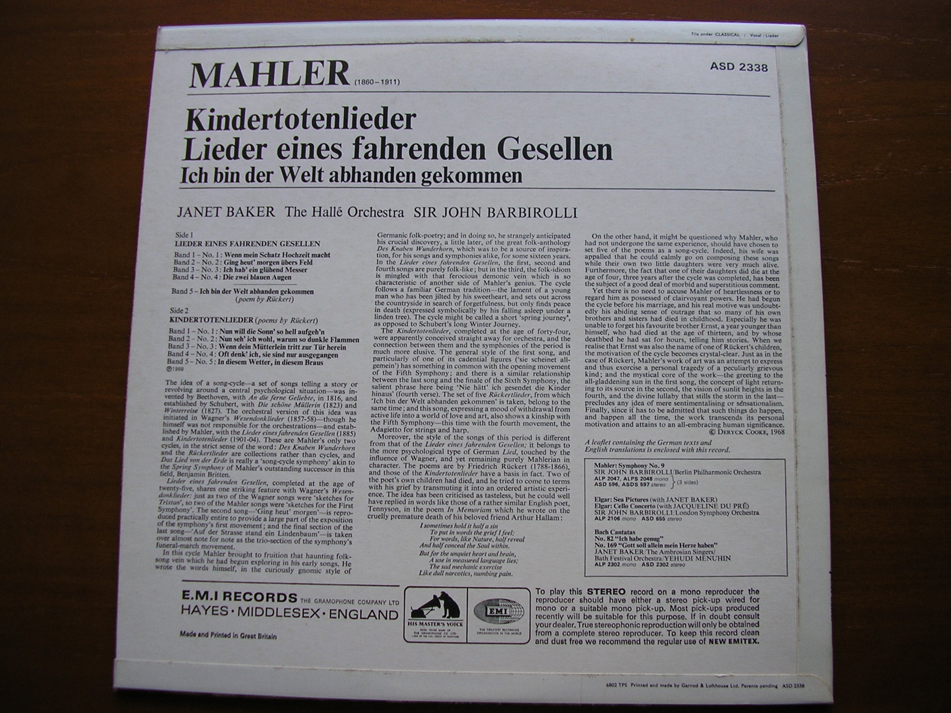 MAHLER: LIEDER EINES FAHRENDEN GESELLEN / KINDERTOTENLIEDER JANET BAKER / HALLE ORCHESTRA / BARBIROLLI ASD 2338