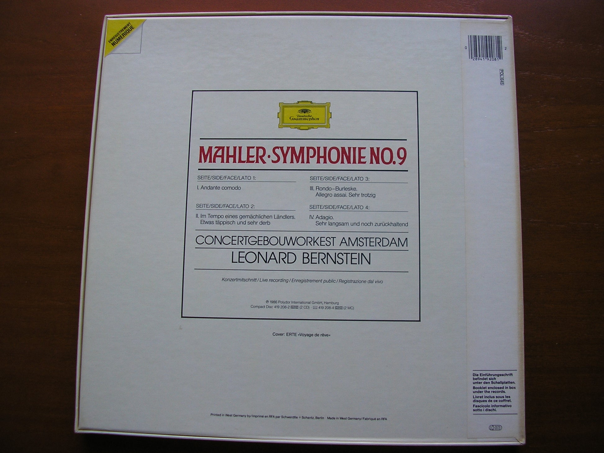 419 208  MAHLER: SYMPHONY No. 9      LEONARD BERNSTEIN / CONCERTGEBOUW ORCHESTRA AMSTERDAM
