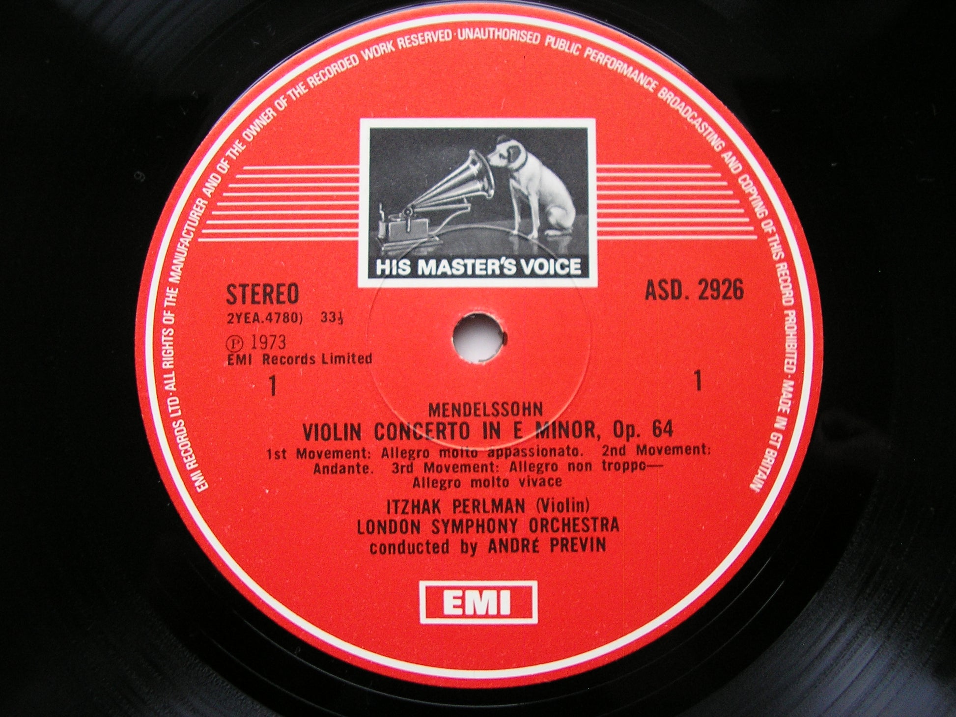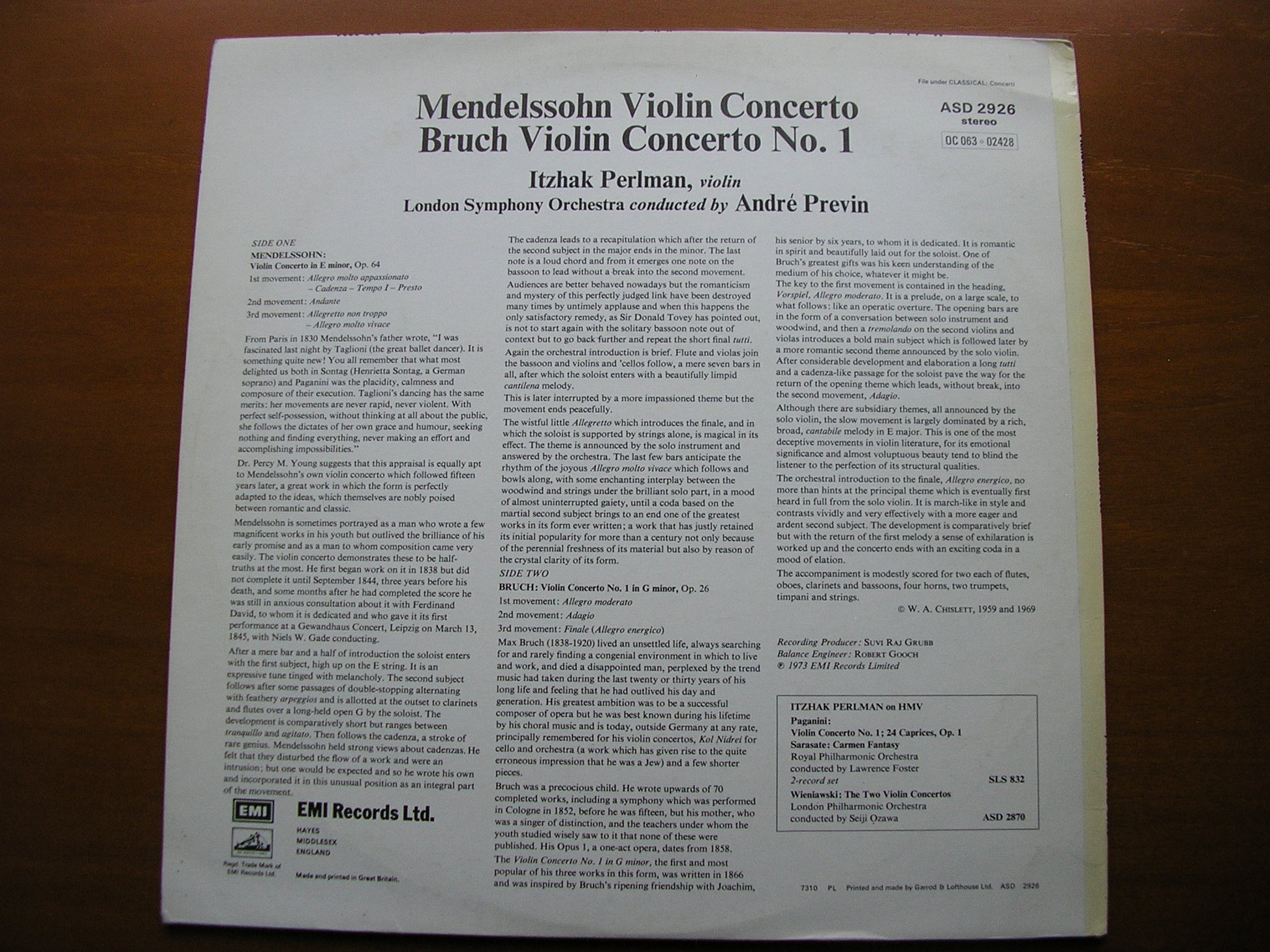 ASD 2926  MENDELSSOHN: VIOLIN CONCERTO in E / BRUCH: VIOLIN CONCERTO No. 1  ITZHAK PERLMAN / LONDON SYMPHONY ORCHESTRA / ANDRE PREVIN