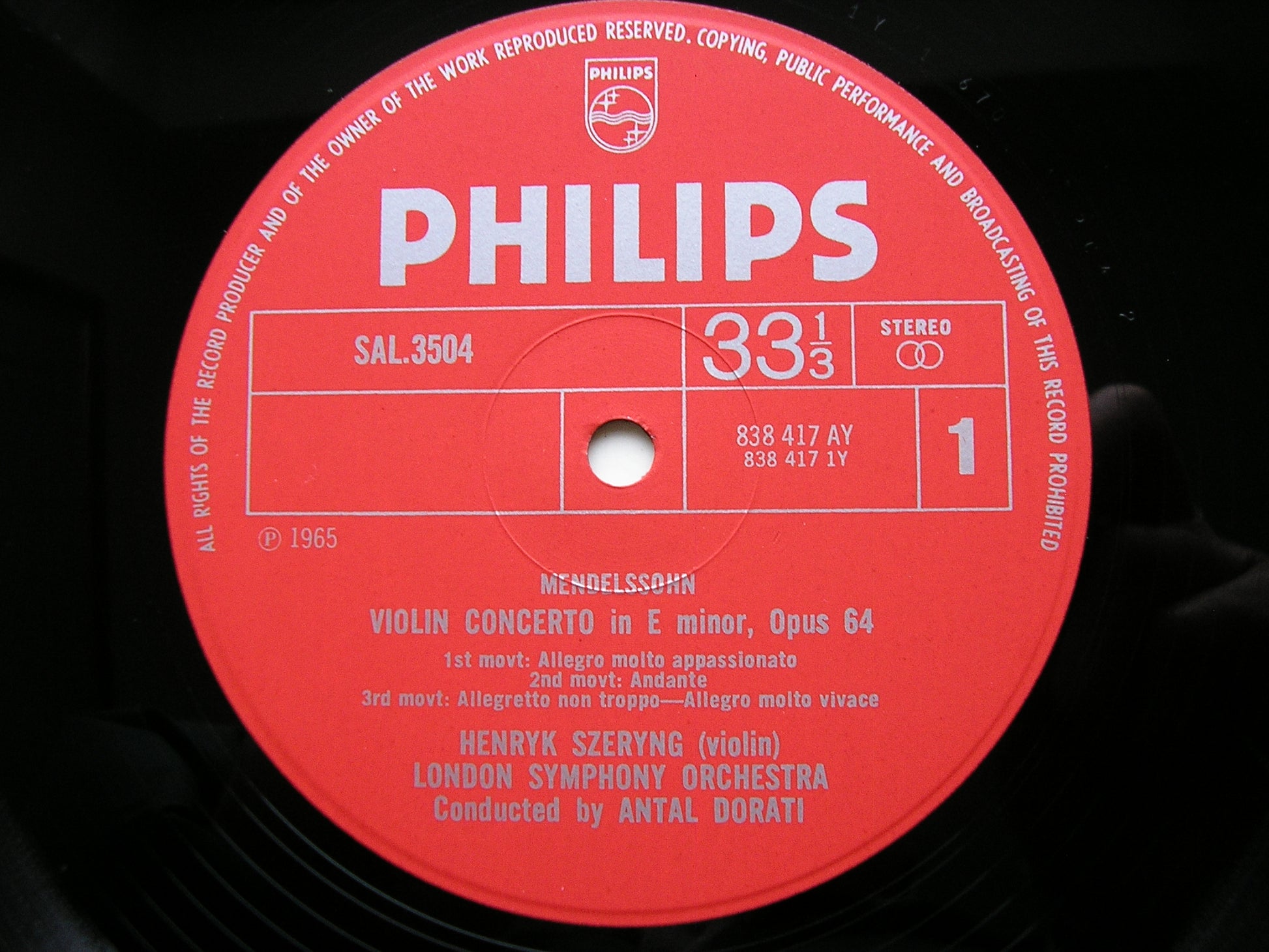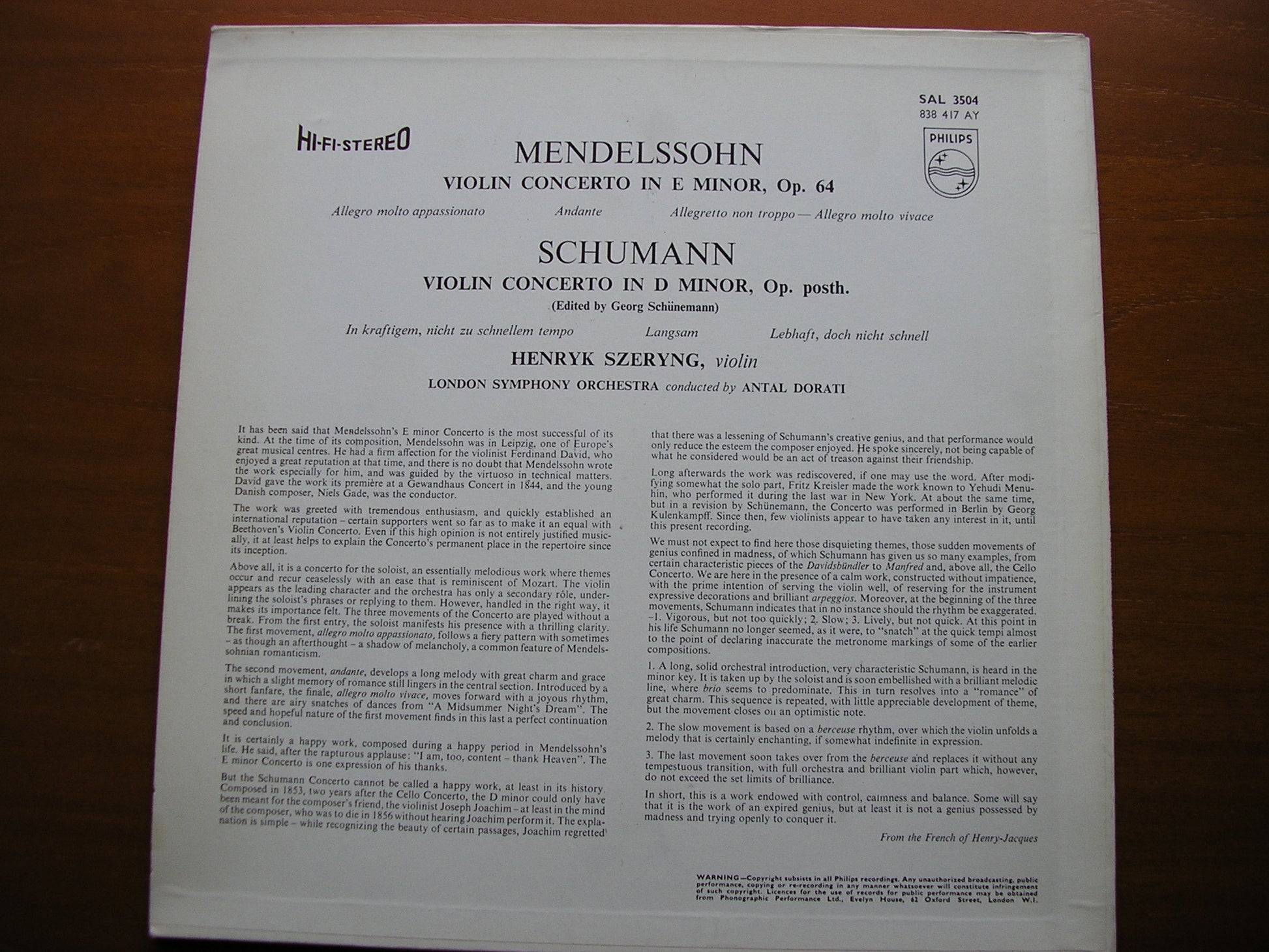 SAL 3504  MENDELSSOHN & SCHUMANN: VIOLIN CONCERTOS    HENRYK SZERYNG / LONDON SYMPHONY ORCHESTRA / ANTAL DORATI