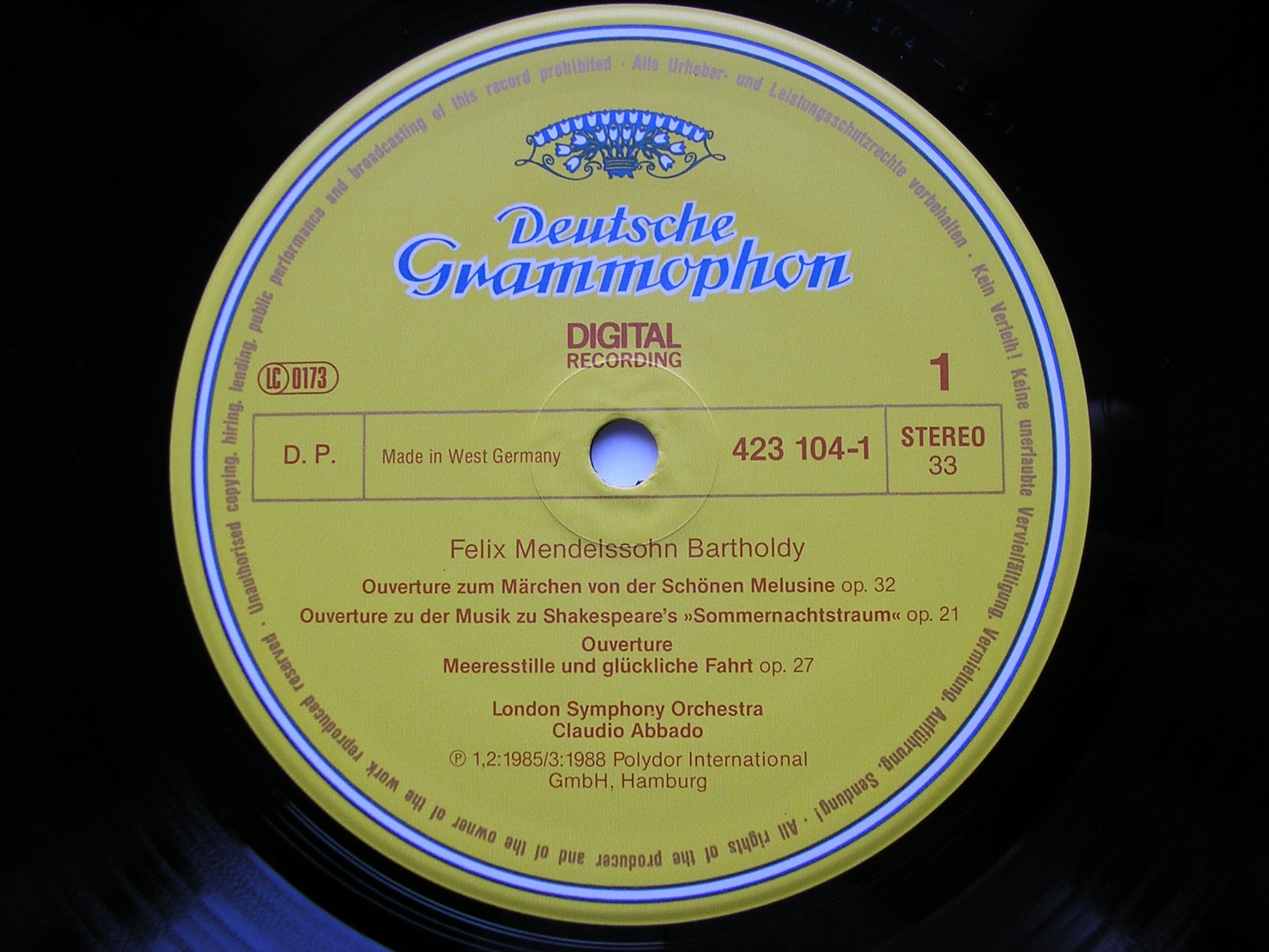 423 104  MENDELSSOHN: OVERTURES Ruy Blas / Midsummer Night's Dream / The Fair Melusina / The Hebrides / Calm Sea & Prosperous Voyage / Trumpet Overture / Overture for Wind Instruments     CLAUDIO ABBADO / LONDON SYMPHONY ORCHESTRA