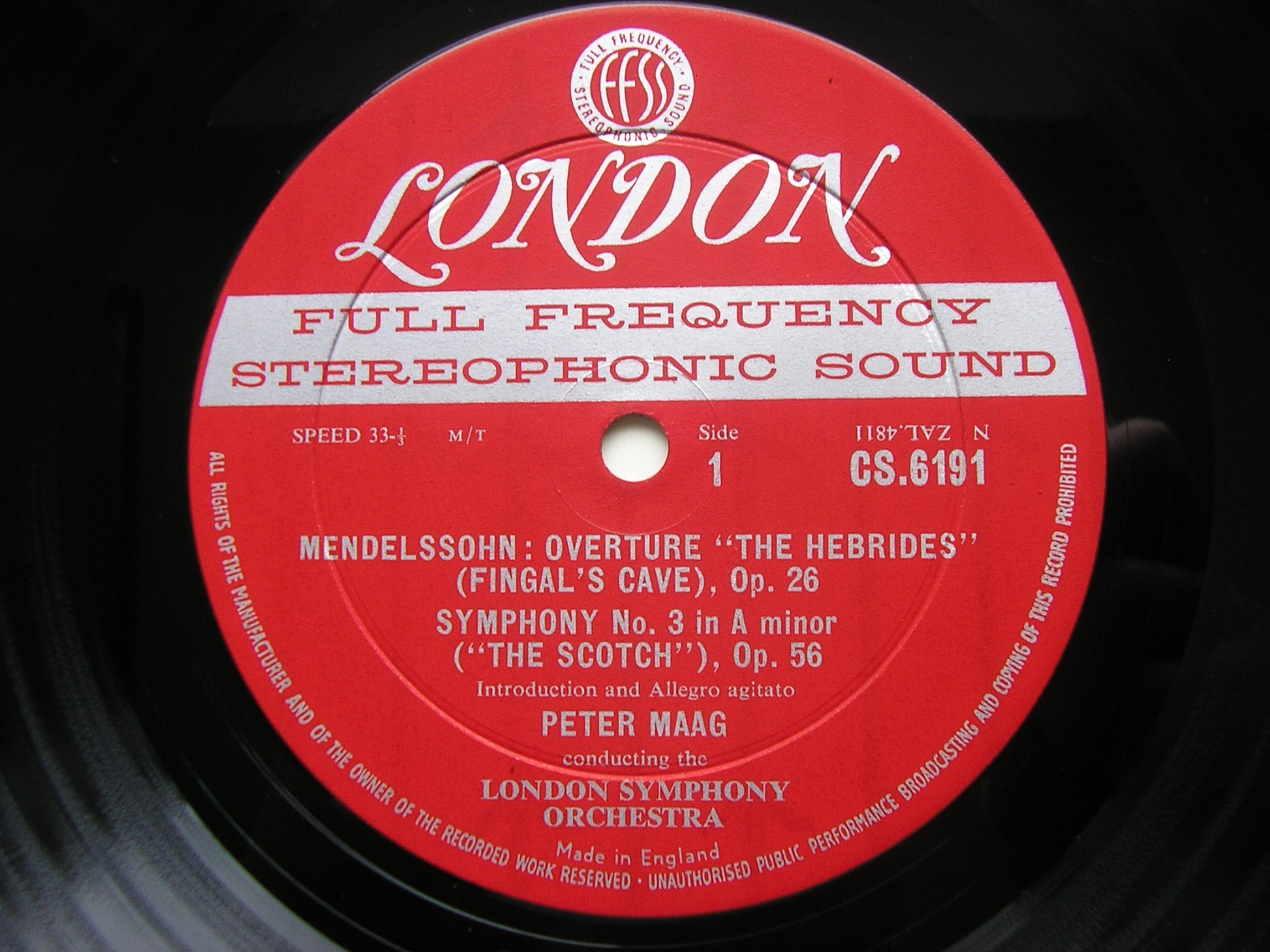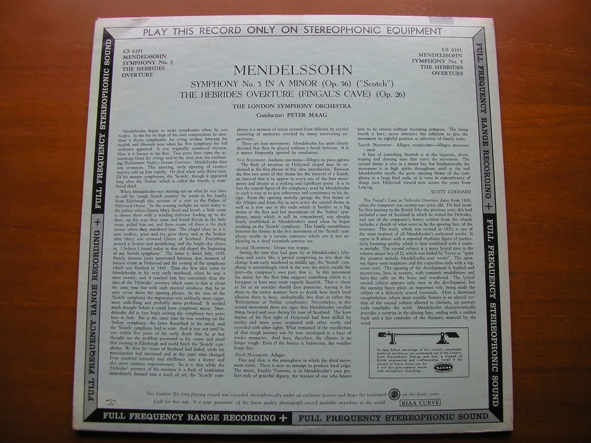MENDELSSOHN: SYMPHONY No. 3 'Scotch' / HEBRIDES OVERTURE MAAG / LONDON SYMPHONY ORCHESTRA CS 6191