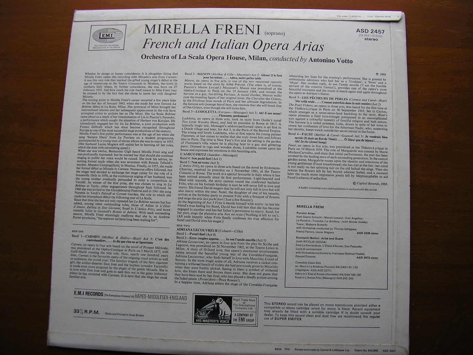 ASD 2457  MIRELLA FRENI SINGS FRENCH & ITALIAN ARIAS: BIZET / GOUNOD / MASSENET / CILEA / MASCAGNI      MIRELLA FRENI / LA SCALA ORCHESTRA / ANTONINO VOTTO