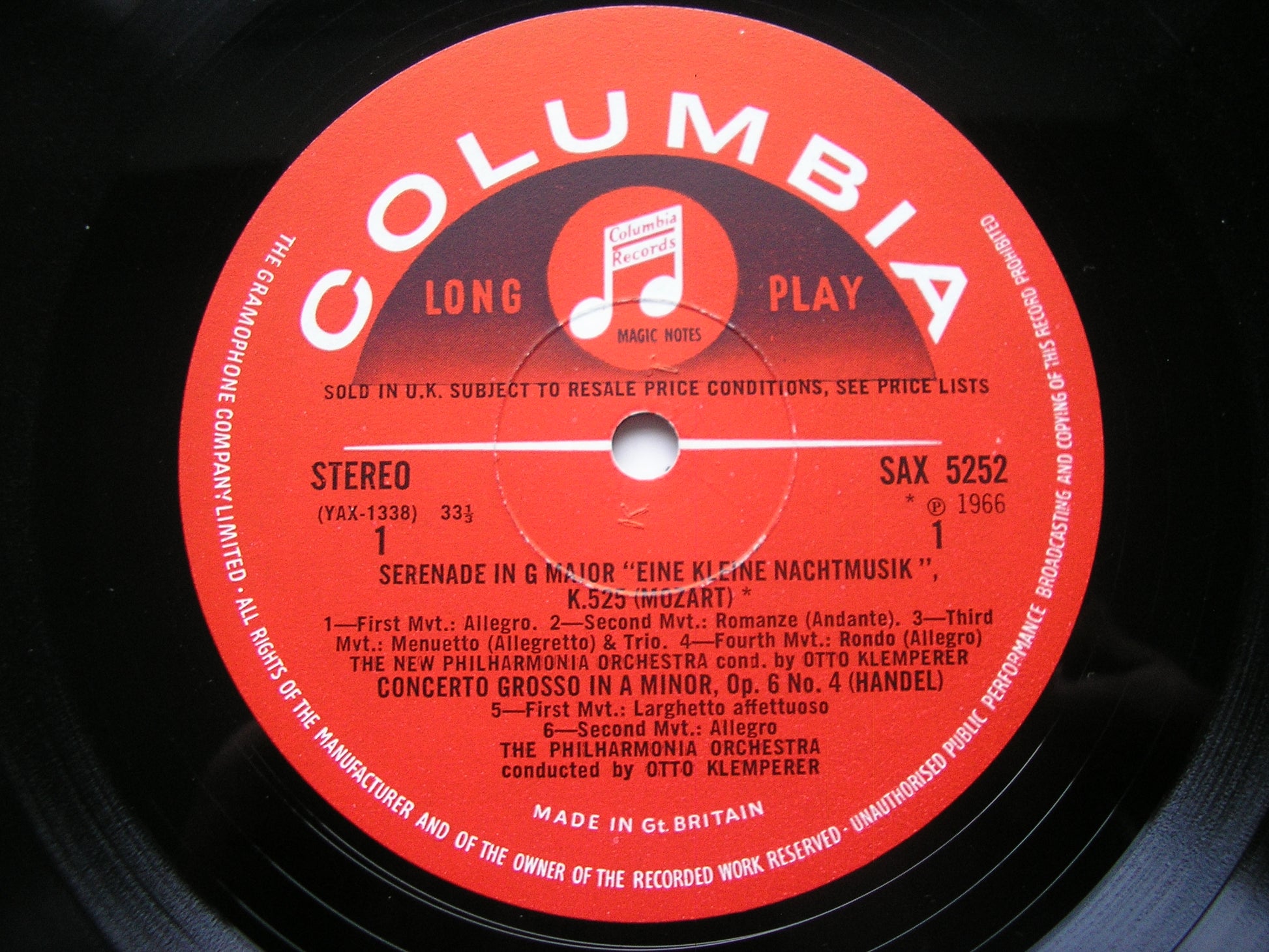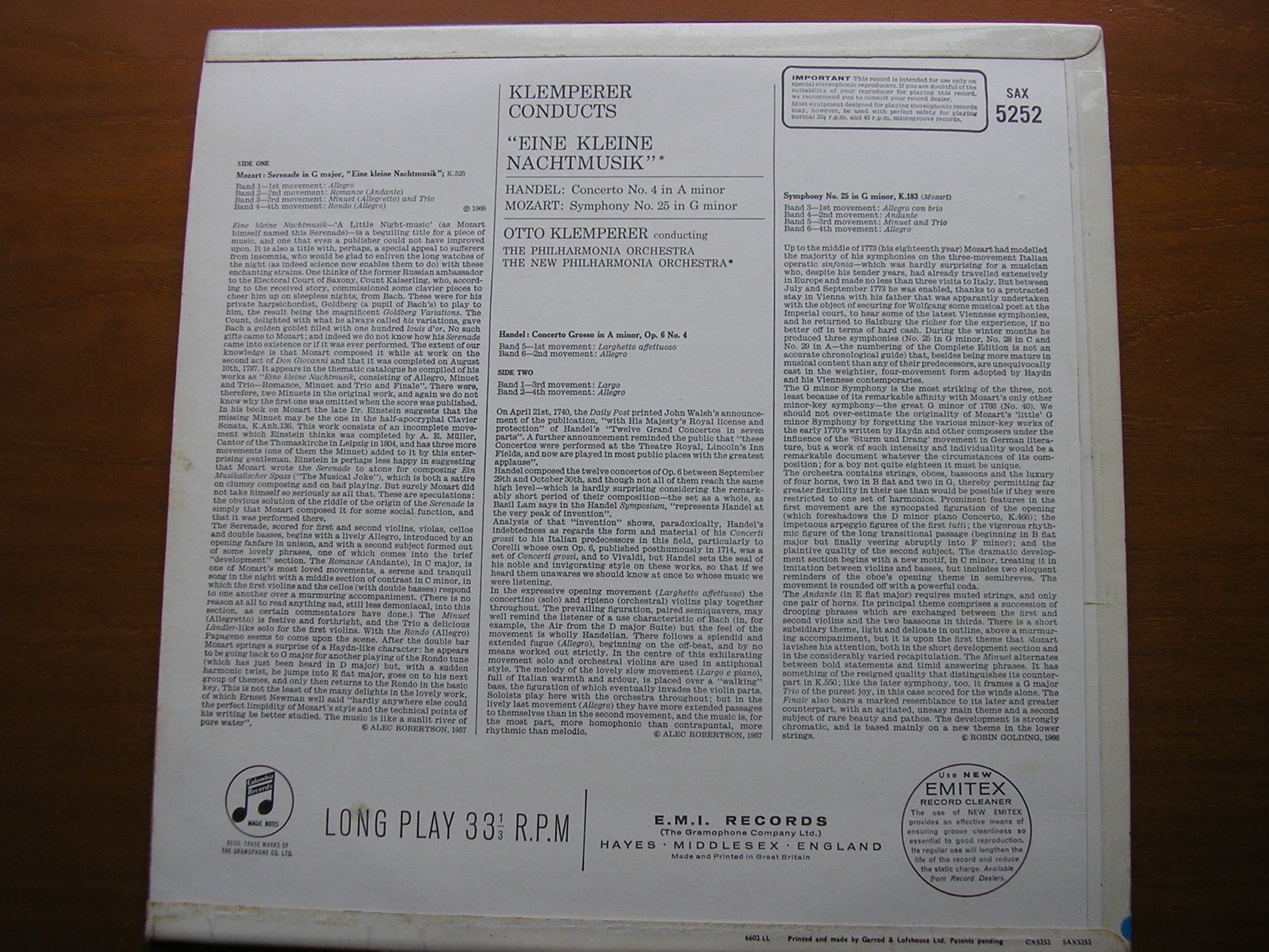 SAX 5252  MOZART: EINE KLEINE NACHTMUSIK / SYMPHONY 25 / HANDEL: CONCERTO GROSSO No. 4       OTTO KLEMPERER / PHILHARMONIA / NEW PHILHARMONIA