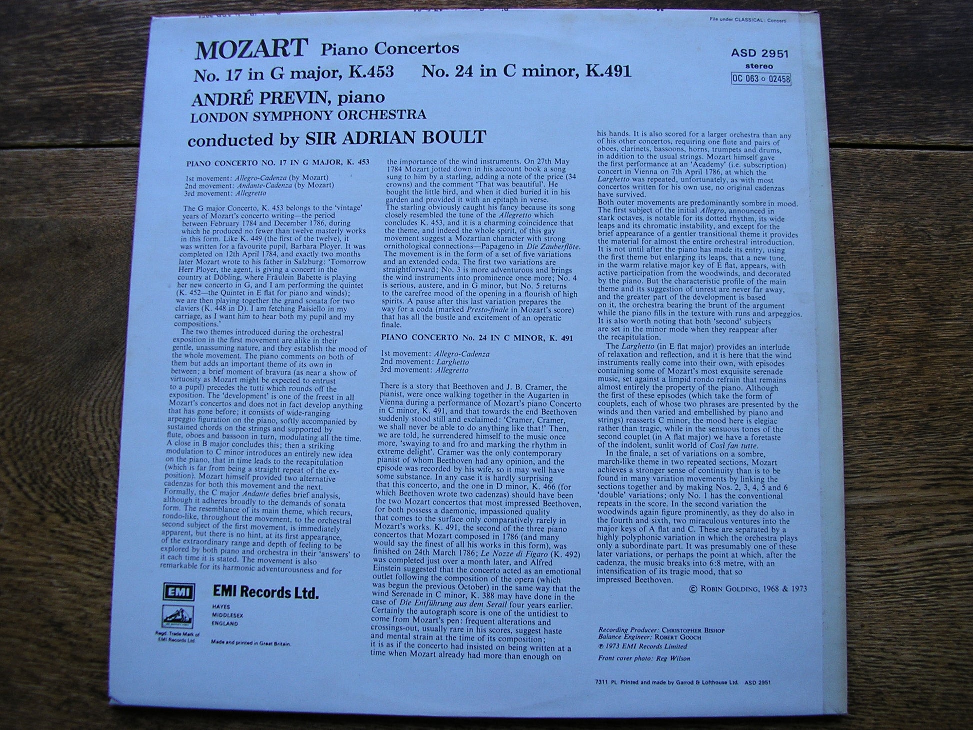 ASD 2951  MOZART: PIANO CONCERTOS  K453  &  K491    ANDRE PREVIN / LONDON SYMPHONY ORCHESTRA / SIR ADRIAN BOULT