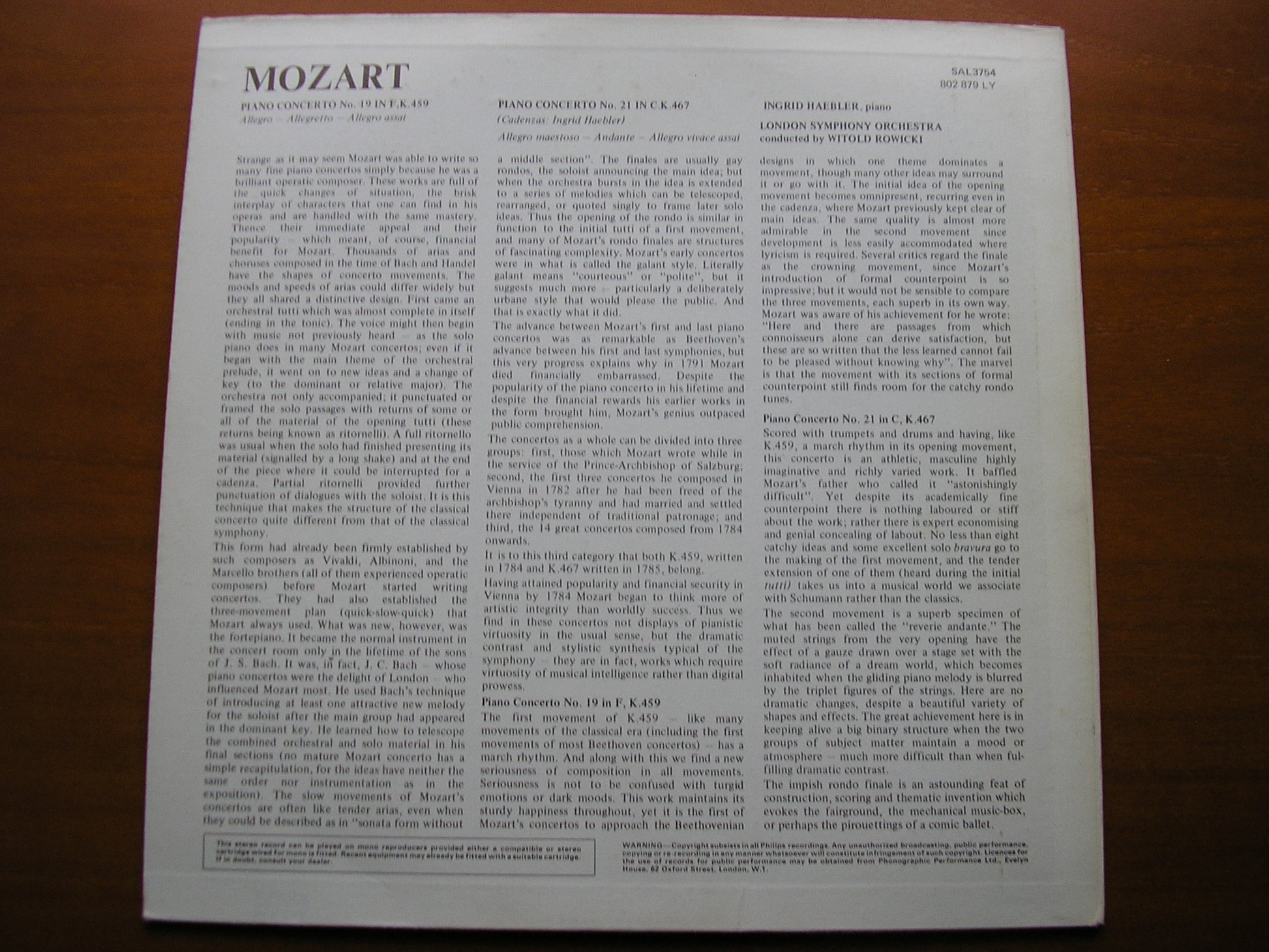 SAL 3754  MOZART: PIANO CONCERTOS  K467  & K459      INGRID HAEBLER / LONDON SYMPHONY ORCHESTRA / WITOLD ROWICKI