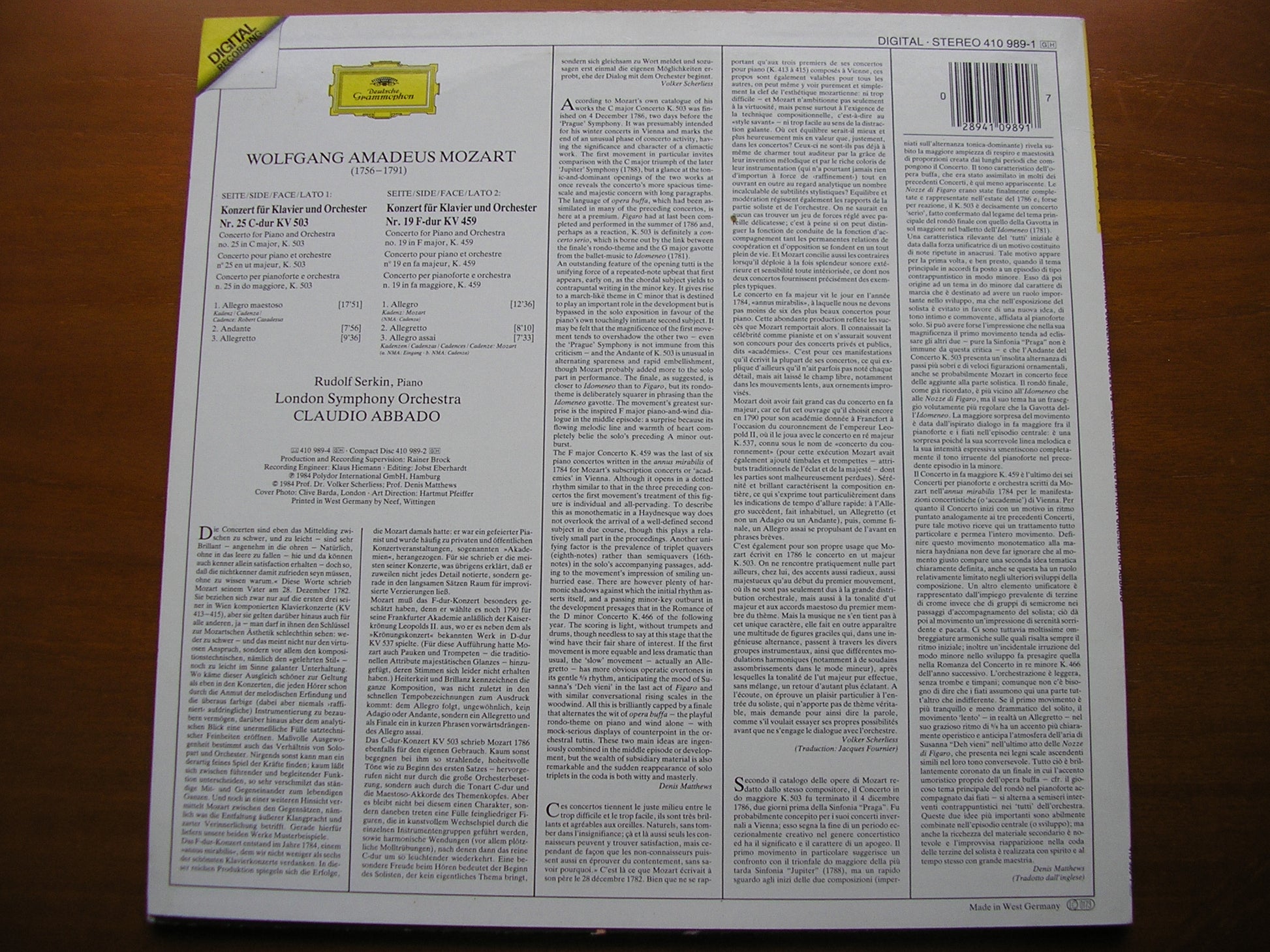 410 989  MOZART: PIANO CONCERTOS K459 & K503     RUDOLF SERKIN / LONDON SYMPHONY ORCHESTRA / CLAUDIO ABBADO