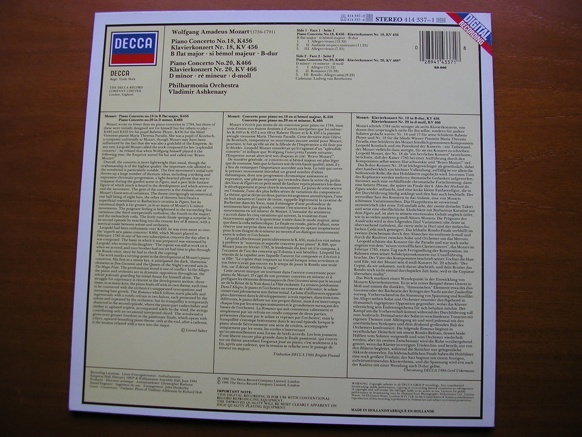 MOZART: PIANO CONCERTOS Nos. 20 & 18 ASHKENAZY / PHILHARMONIA 414 337